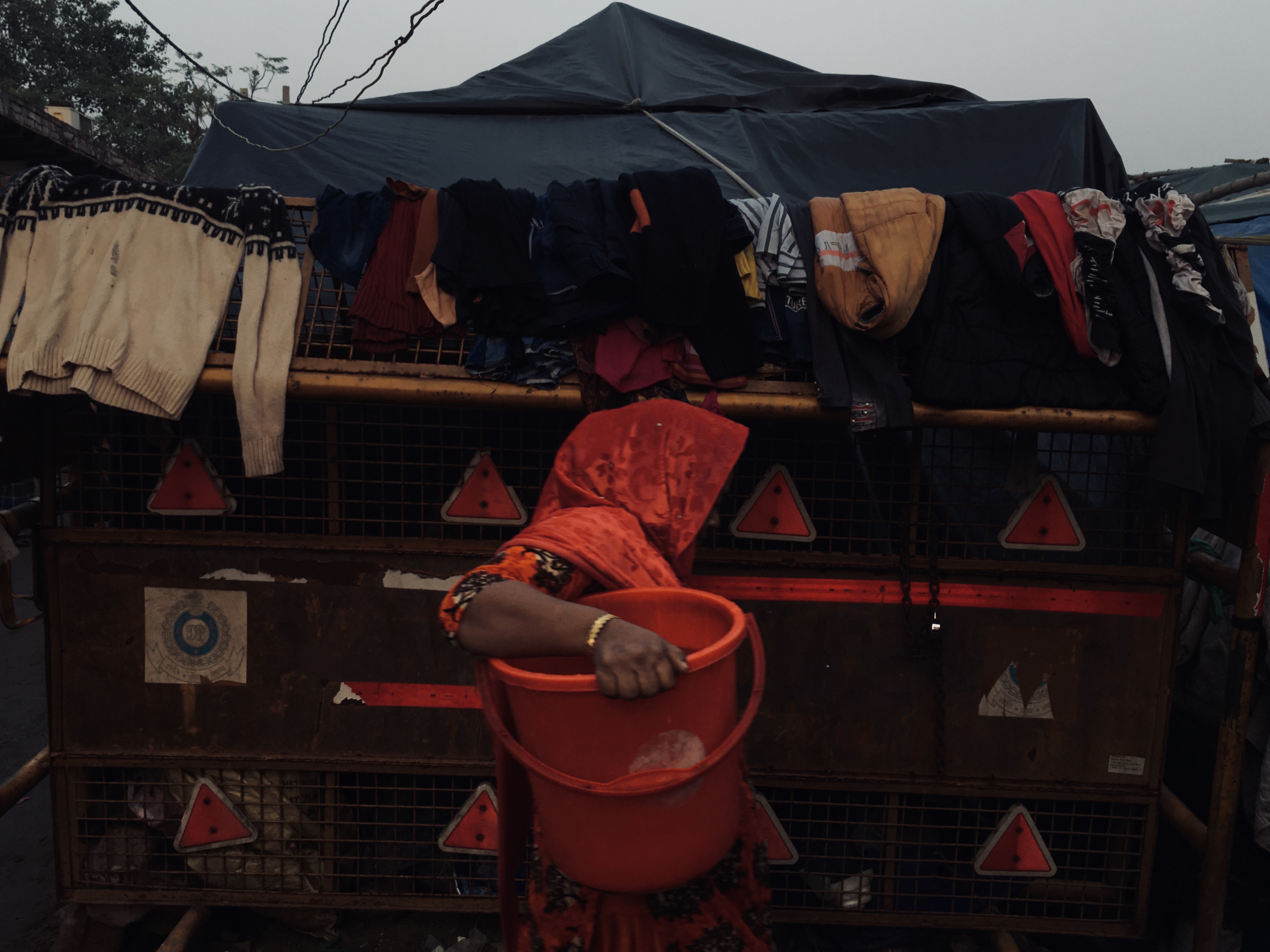 Clothes are kept to dry over a police barricade. | Photo by Shadab Farooq[/caption]