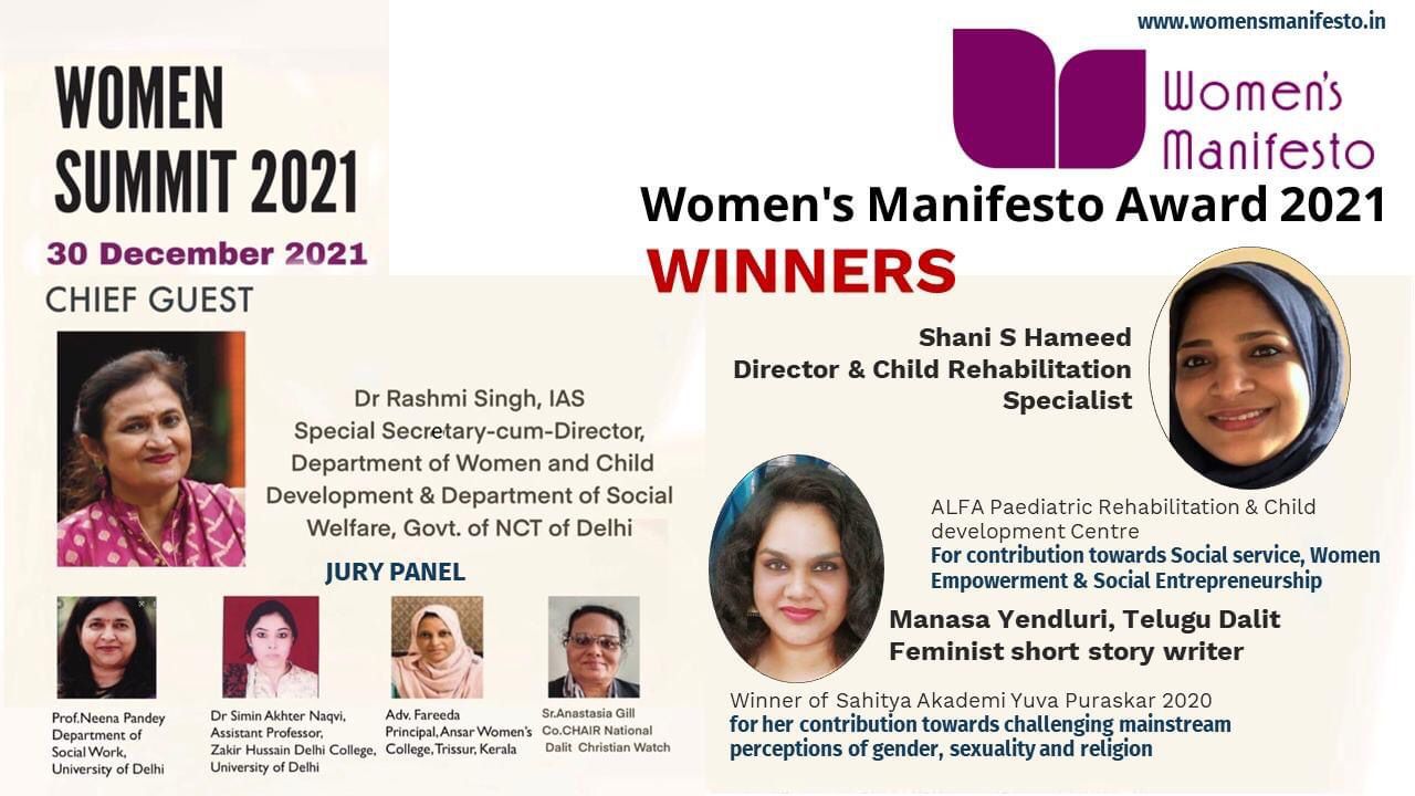 NEW DELHI — Manasa Yendluri, a young Telugu short-story writer and Shani S. Hameed, a physiotherapist and Founder, Director and Rehabilitation Child Specialist of Alfa Paediatric Rehabilitation Centre, received awards from Women’s Manifesto New Delhi at the Women Summit 2021.