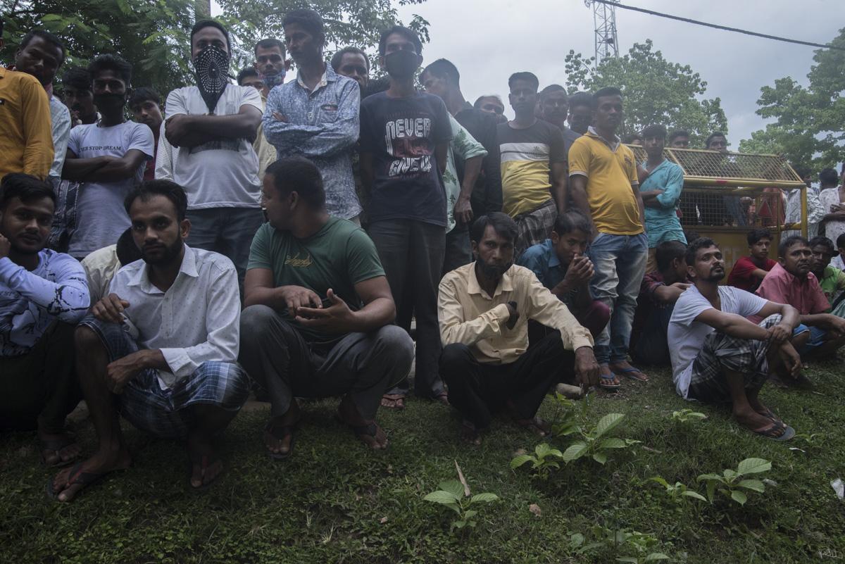 A few locals of Lailapur who helped set up an electric pole for this shed/post of the Assam police officers wait for permission to go and have lunch at their homes on the other side of the police barricades, in Lailapur itself. | Photo by Abhishek Basu[/caption]