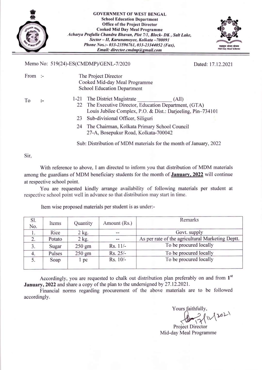 Official notice put out by the West Bengal government on Mid Day Meals for January 2022.[/caption]