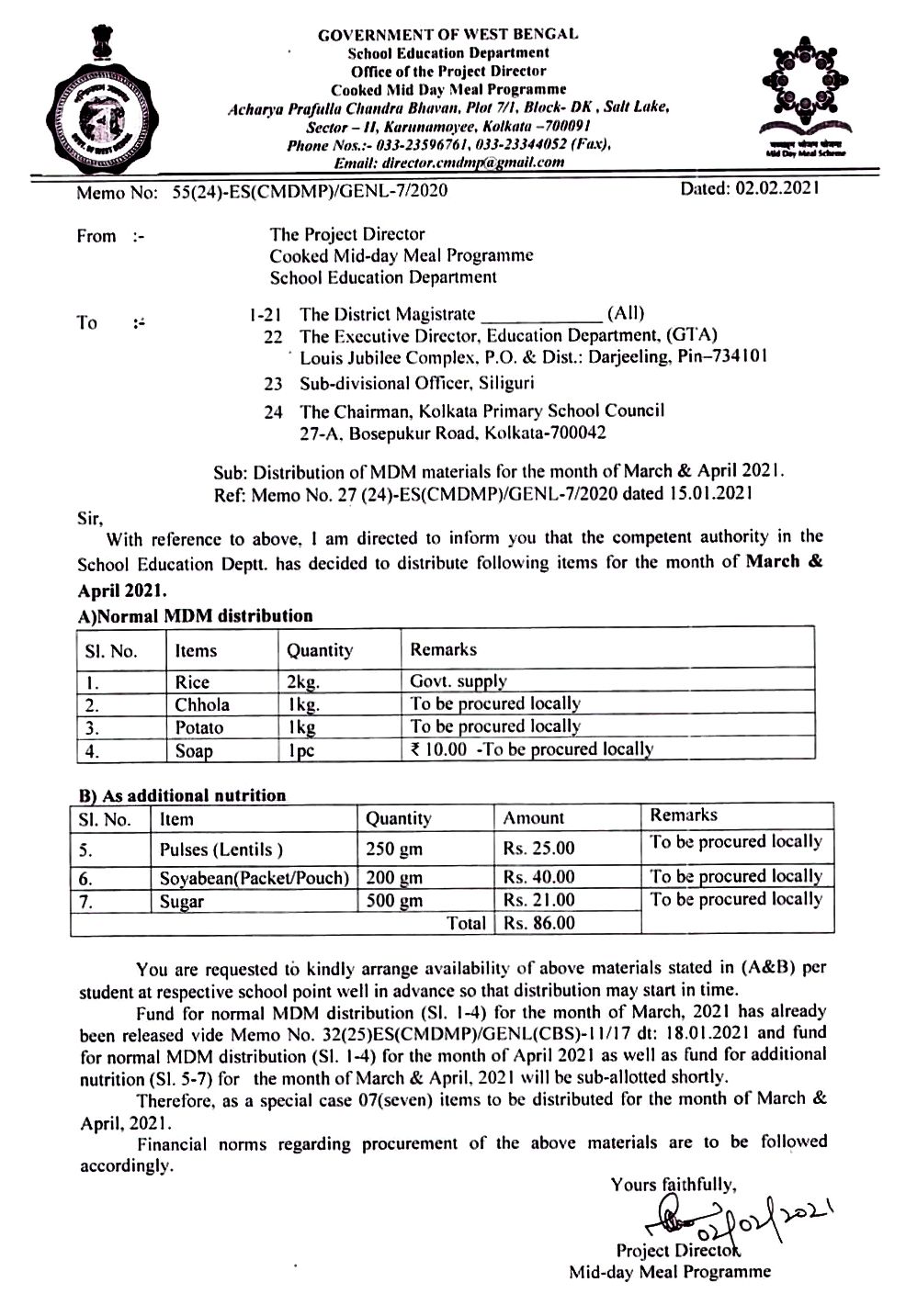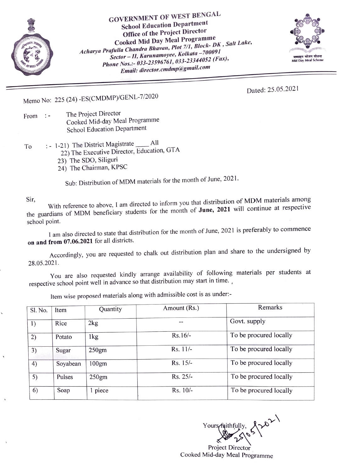 Official notice put out by the West Bengal government on Mid Day Meals for June 2021.[/caption]