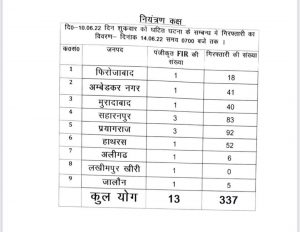 उत्तर प्रदेश के कई जिलों में बीते शुक्रवार को पैगंबर मोहम्मद पर निलंबित बीजेपी नेताओं की टिप्पणी को लेकर हुए विरोध प्रदर्शन में हुई हिंसा के मामले में यूपी पुलिस ने अभी तक कुल 13 एफआईआर दर्ज करते हुए 337 लोगों को गिरफ्तार किया है। यूपी पुलिस ने गिरफ्तार करें हुए लोगों पर हिंसा करने का आरोप लगाया है। खास बात यह है कि पैगम्बर पर आपत्तिजनक टिप्पणी करने वाली नुपूर शर्मा को अब तक गिरफ्तार नहीं किया गया है।