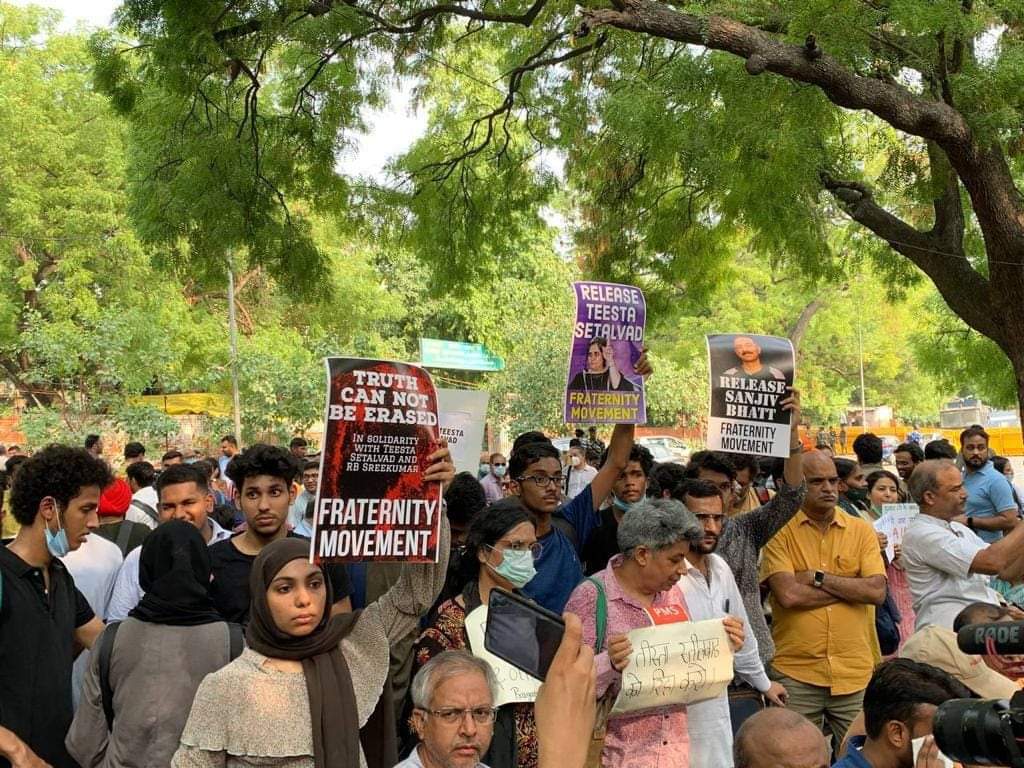 दिल्ली के जंतर-मंतर पर सोमवार शाम को विभिन्न छात्र, शिक्षक, महिला और समाजिक संगठनों से जुड़े लोग इकट्ठा हुए और तीस्ता सीतलवाड़, आर बी श्रीकुमार, संजीव भट्ट की रिहाई की मांग को लेकर विरोध प्रदर्शन किया गया। प्रदर्शन के दौरान समाजिक कार्यकर्ताओं ने तीस्ता सीतलवाड़ की गिरफ्तारी को सरकार की एक सोची समझी साजिश बताया है।