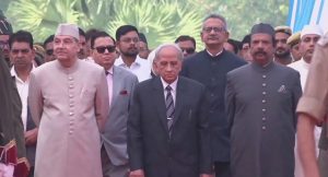 कुलपति तारिक मंसूर, प्रोफ़ेसर ताहिर महमूद, चंदन सिन्हा आईएएस, जस्टिस इकबाल अहमद अंसारी – कार्यक्रम से पहले मंच पर जाते हुए।[/caption]