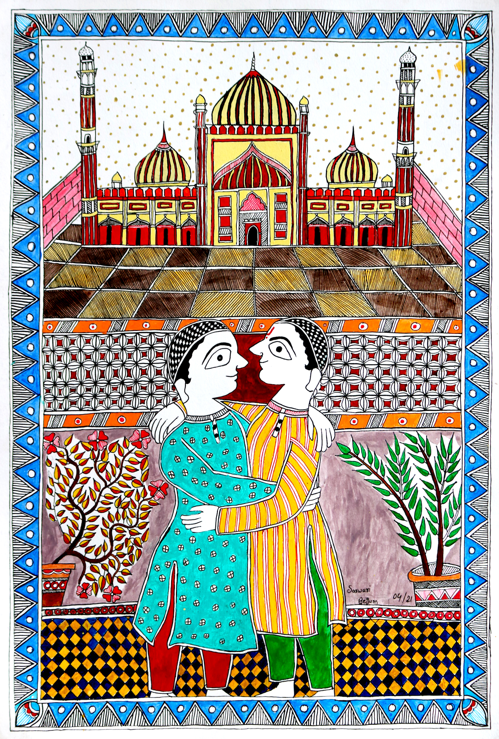 Sarwari Begum's painting "Eid Mubarak" depicts brotherhood between Hindus and Muslims[/caption]