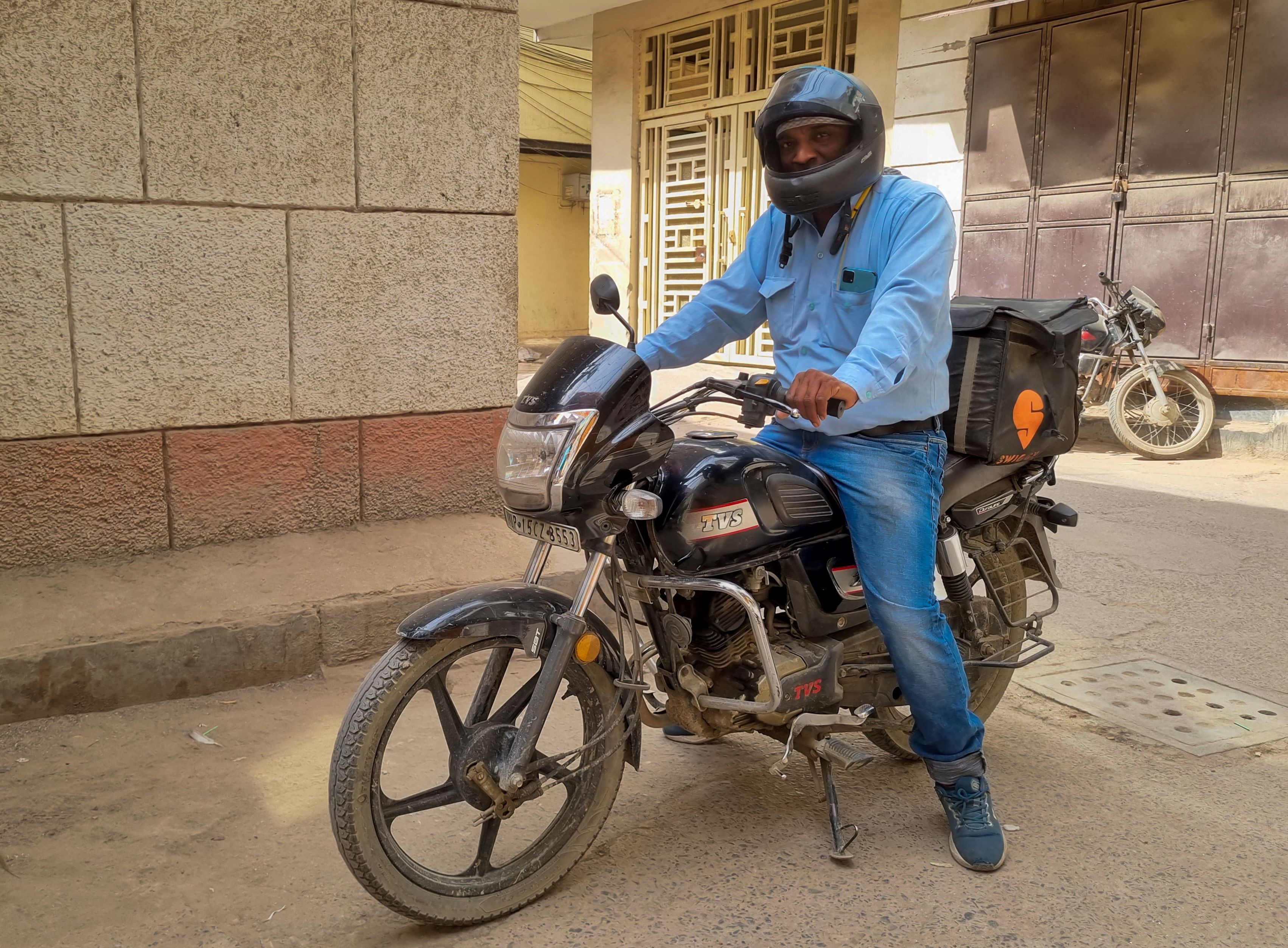 Wearing a blue shirt and jeans, with a black and orange Swiggy delivery bag slung over his shoulder, 47-year-old Ahmad is a tall and well-built man, wearing a beard and a friendly smile. A native of Meerut in Uttar Pradesh, Ahmad previously worked as a motorcycle mechanic before joining Swiggy as a contractual employee four years ago.