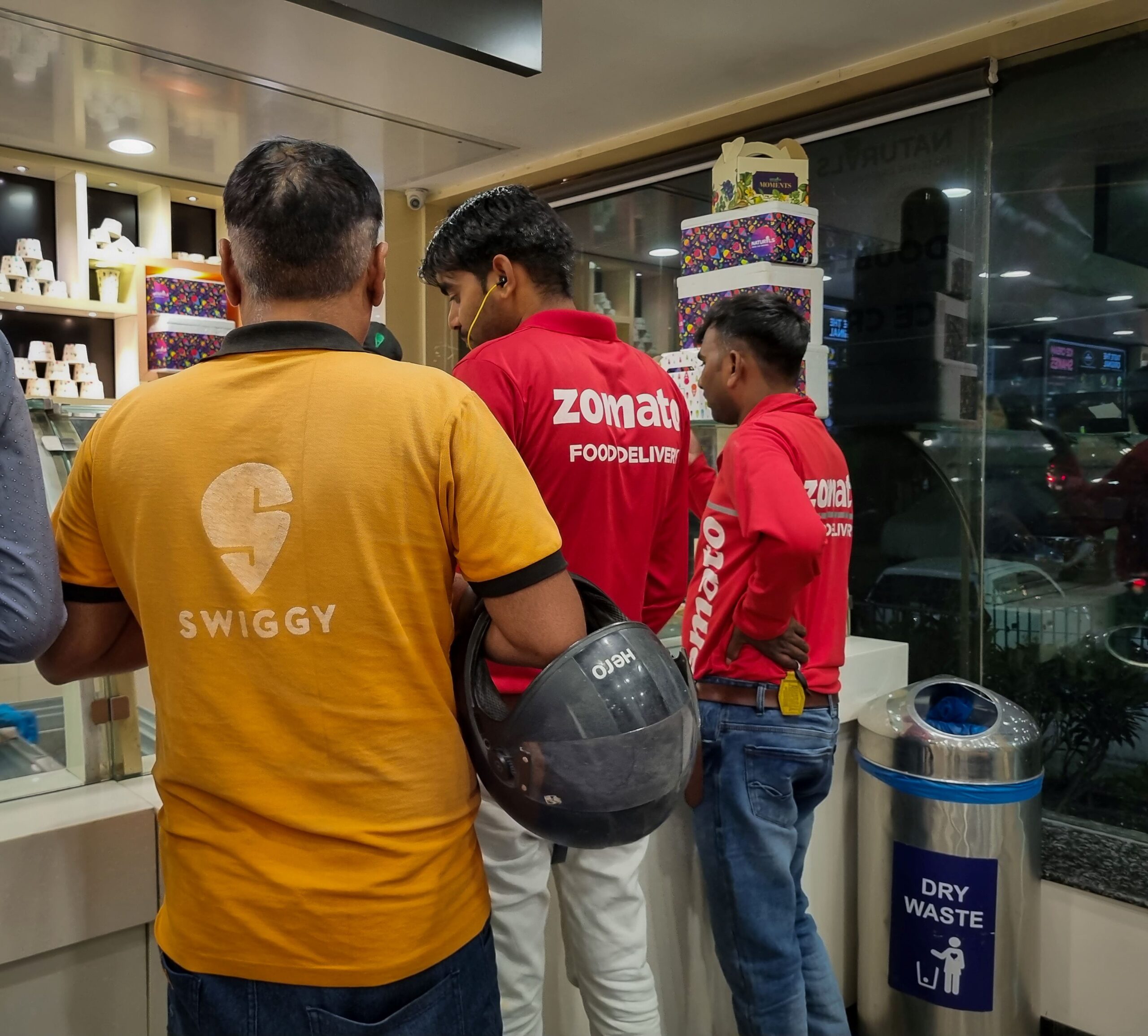 After he finishes his prayers, his phone beeps, notifying him of a new order. He quickly gets on to his motorcycle and weaves his way through the busy evening traffic, dodging cars and pedestrians with ease. Just as he stops at a restaurant serving Mughlai cuisine to collect an order of chicken tikka, chicken kababs, and biryani, his phone buzzes with an order notification from an ice cream parlour. He quickly confirms the order details, deftly packs the first order and leaves for the next.