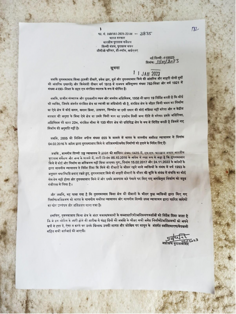 A Dalit majority area consisting of more than 25,000 houses situated near the Tughlaqabad Fort in New Delhi is facing the threat of evictions after the Archaeological Survey of India (ASI) served an eviction notice to residents last month.