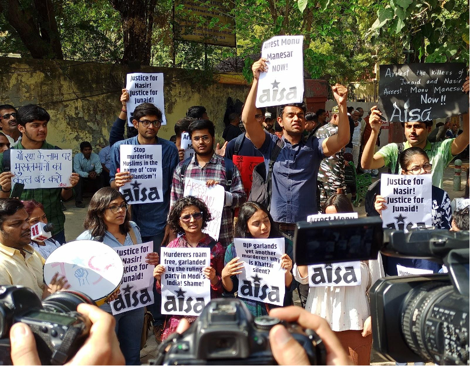 At a protest on Friday at New Delhi's Jantar Mantar, student bodies urged the government to arrest the accused in the killing of two Muslim men in Haryana.