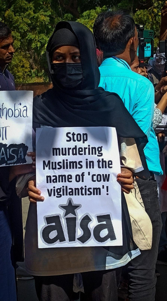 “We are demanding immediate arrest of the accused. The state is giving protection to them. Everybody knows that it’s very difficult to organize such a huge protest but such a big event (<ahapanchayat) happened in support of the lynching accused. So it’s clear cut that the government and the police are supporting him,” said Amir, a student.