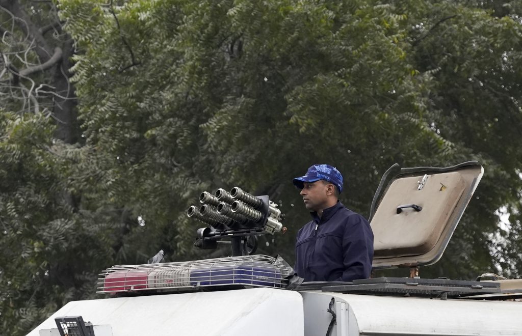 A Rapid Action Force personnel mans a tear-gas gun atop a police truck. | TCN Photo by Arbab Ali[/caption]