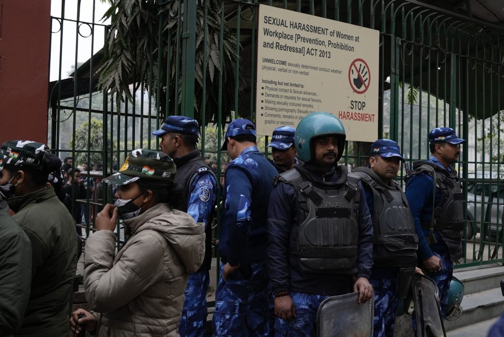Paramilitary personnel stand guard outside Jamia campus to deter students from screening a documentary by BBC on PM Modi. | TCN Photo by Arbab Ali[/caption]