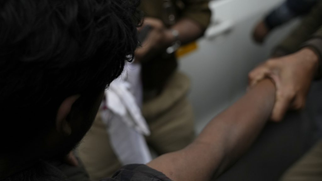 A police personnel grabs the wrist of a protesting Jamia student while detaining him. | TCN Photo by Arbab Ali[/caption]
