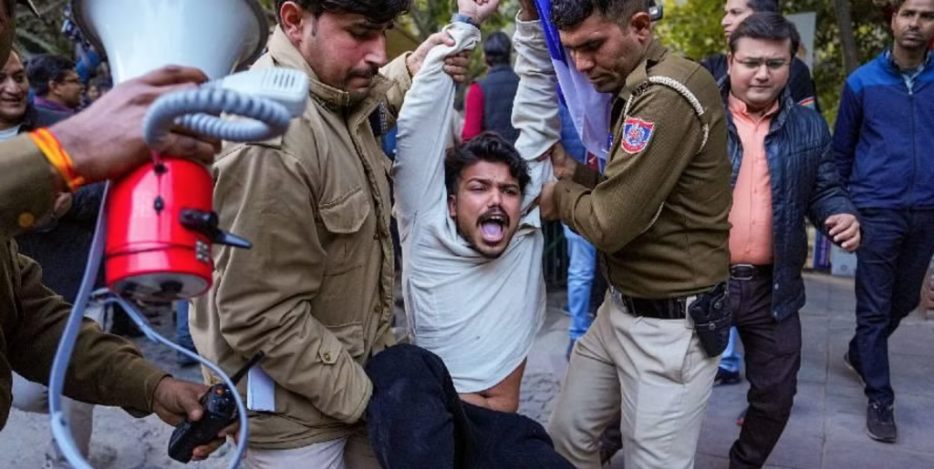 Police personnel detain members of Bhim Army Student Federation for planning to screen the BBC documentary film "India: The Modi Question", at Delhi University Arts Faculty, in New Delhi on Jan. 27, 2023 | Photo: PTI[/caption]