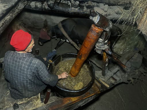 Inside a dimly lit old two-story mud and timber house patched with tin sheets, 82-year-old Ghulam Mohammad Wani guides an old angled wood beam with his frail hands. The wooden beam is drenched in oil as the mustard seeds get crushed.