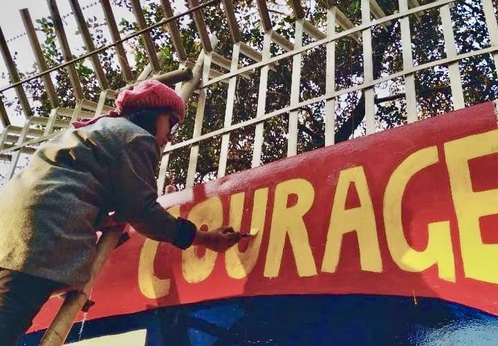 Anjum painted a portrait of JNUSU president Aishe Ghosh against a red background on one of the walls of Jamia Millia Islamia. Ghosh was attacked on the JNU campus on January 5, 2020. Another mural she created was an excerpt from Paash, a major poet in the Punjabi literature of the 1970s: “main ghaas hoon, main apanaa kaam karoongaa, main aapake har kie-dhare par ug aaoongaa”