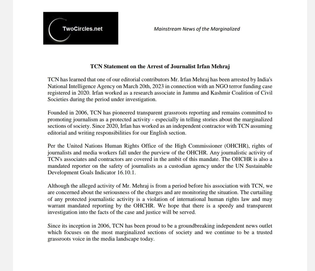 TCN Statement on the Arrest of Journalist Irfan Mehraj