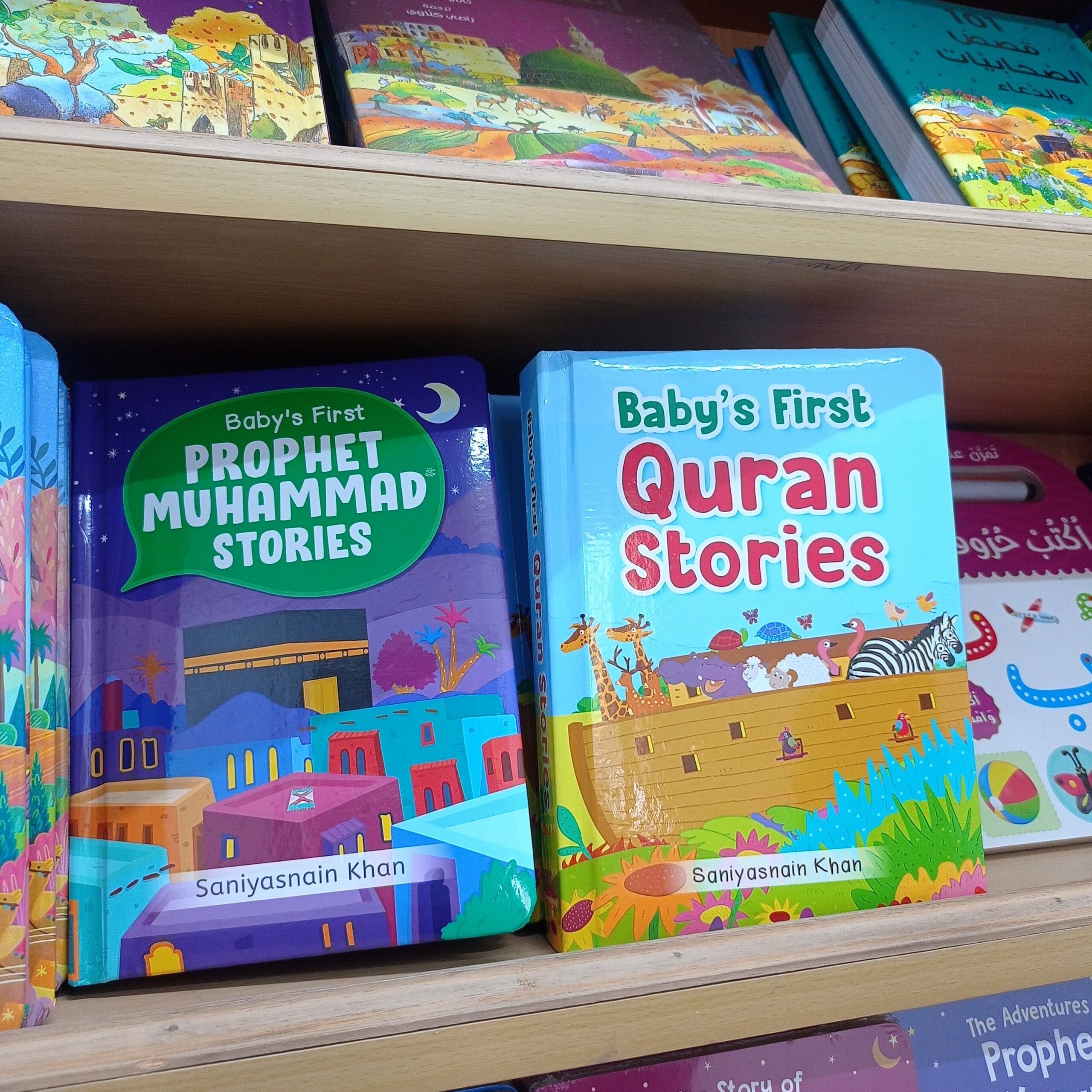 A bookshelf in the corner stacks Islamic books for children, such as “Baby’s first Prophet Muhammad stories” and “Baby’s first Quran stories”.