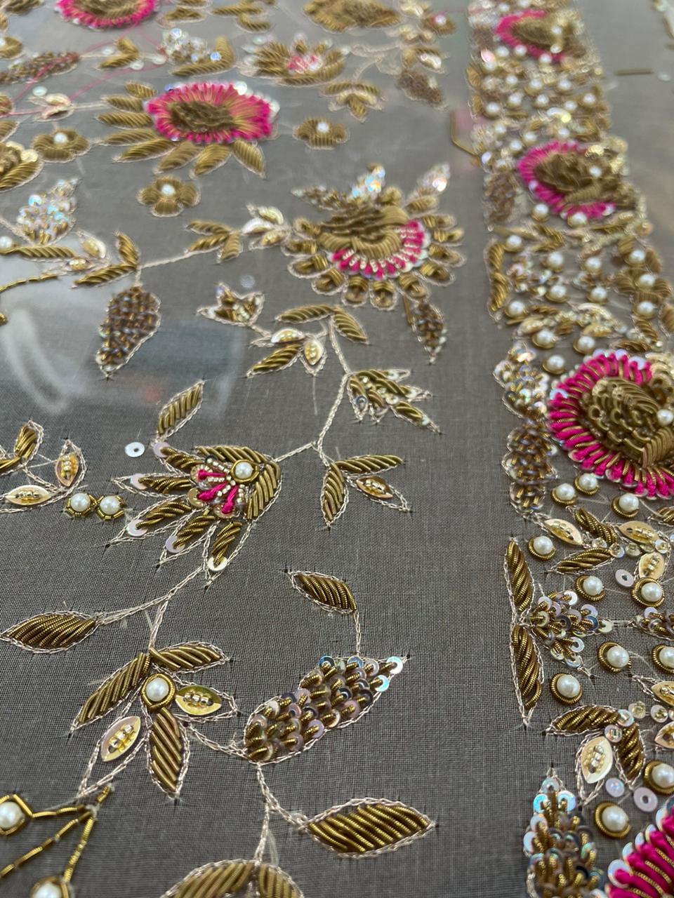 Zardozi is a form of embroidery that came to India from Persia. Its literal translation, “zar” meaning gold, and “dozi” meaning embroidery, refers to the process of using sharp metallic wires threads of gold and silver and semi-precious stones to sew embellishments like flowers and other designs onto various fabrics. This intricate art is said to have been brought to India by the Mughal rulers.