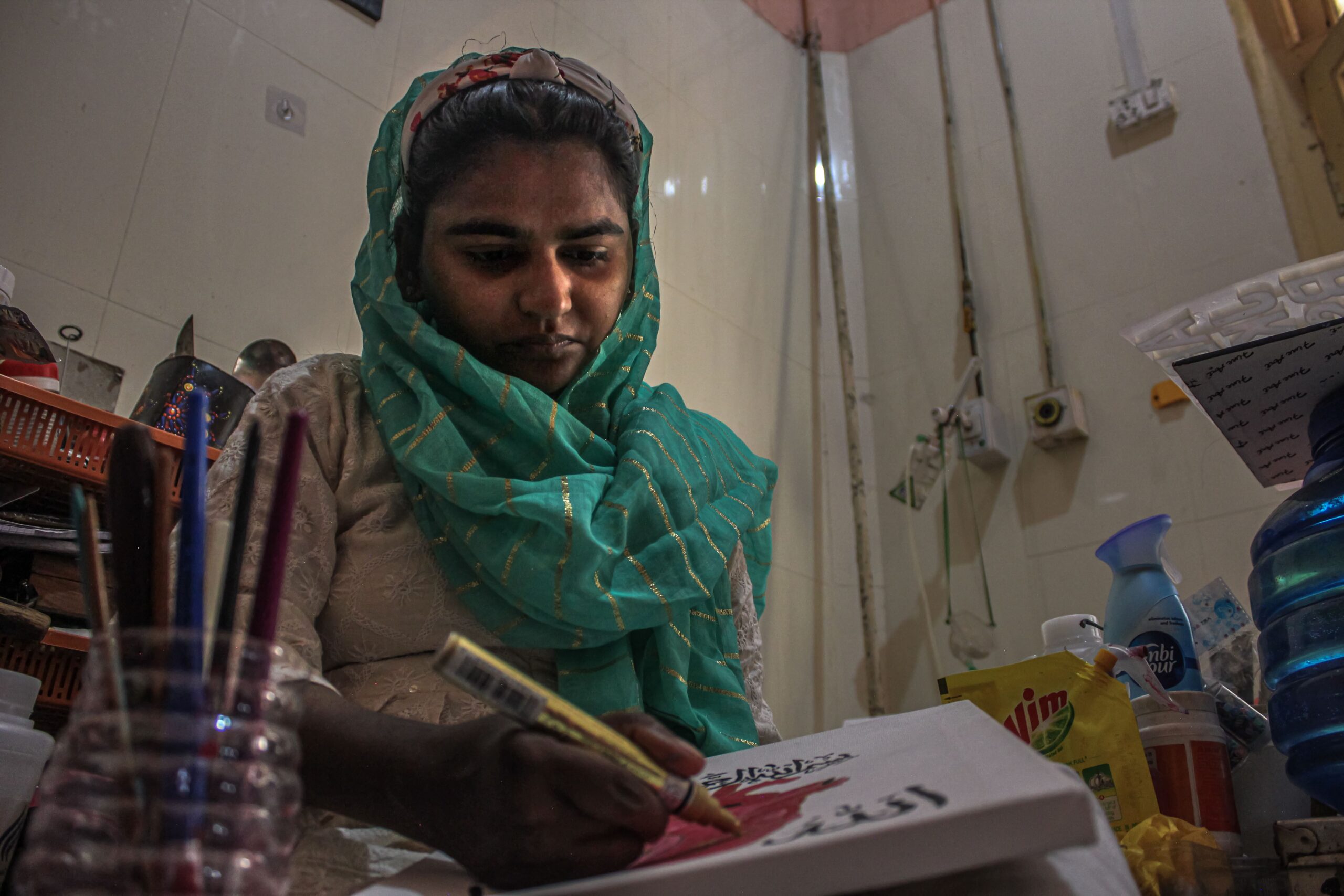 During her stay at the hospital in 2019, one of the staff members motivated Saima towards drawing and gradually she started doing calligraphy. She hopes to find the occasional customer to support her livelihood. "The colours and strokes are my only companions. When I immerse myself in them, I become oblivious to the pain and the hospital's commotion around me," Saima murmurs as her hands guide the paint onto the canvas.