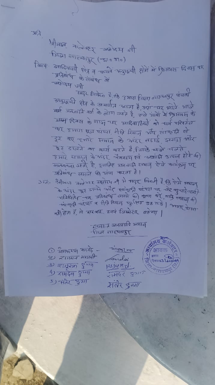 This year, all tribal communities in Bastar wrote a letter to the district collector asking for restrictions on Christmas celebrations in Narayanpur. They claimed that Bastar falls under the 5th Schedule area and that Christmas is not a traditional tribal festival. They argued that the celebrations create unnecessary tension within the community.