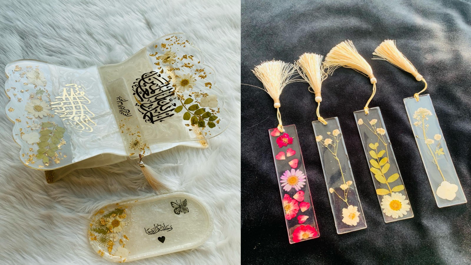 Ayesha completed the Rehal by following the step-by-step instructions and surprised her sister. Encouraged by her family, Ayesha attempted to make additional items. Calligraphy was easy for her because of her natural talent for imitating any art form, and she was a self-taught calligraphy artist. With her new pastime, she began creating resin frames with calligraphy of Quranic ayats, bookmarks, key chains, 99 names of Allah, trays, and other souvenirs.