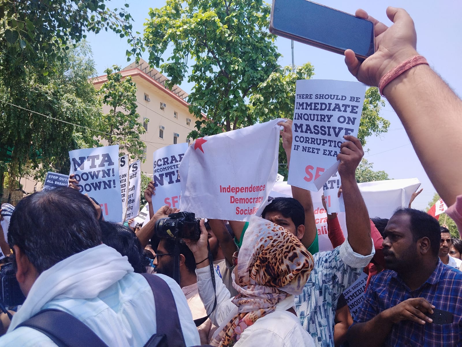 Emerging at around 11 am, a unified cohort of students displayed banners emblazoned with grievances related to the alleged NEET scandal, bravely voicing their demands for justice in the face of a heightened police presence.