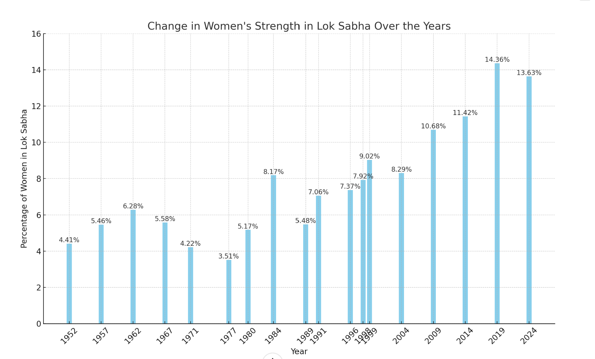 In the 2024 Lok Sabha elections, India elected 74 women MPs, down from 78 in 2019, indicating a decrease in women's representation. Despite progress over the decades, achieving gender parity in the Indian Parliament remains a gradual and uneven process.