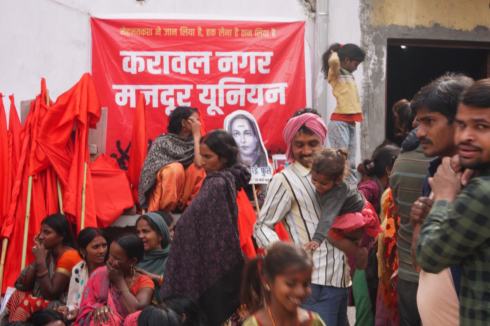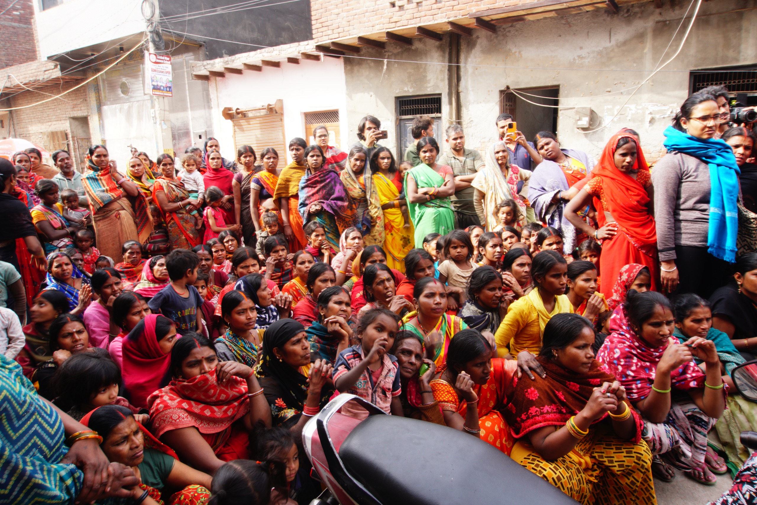 On a warm March morning, Rinku Devi, 36, sits outside the Government Senior Secondary School in the narrow lanes of Karawal Nagar, a neighbourhood in northeast Delhi, with over a hundred other people, mostly women covering half of their faces with the ghoonghat (veil) of their sarees with one hand and holding red flags and placards in other.