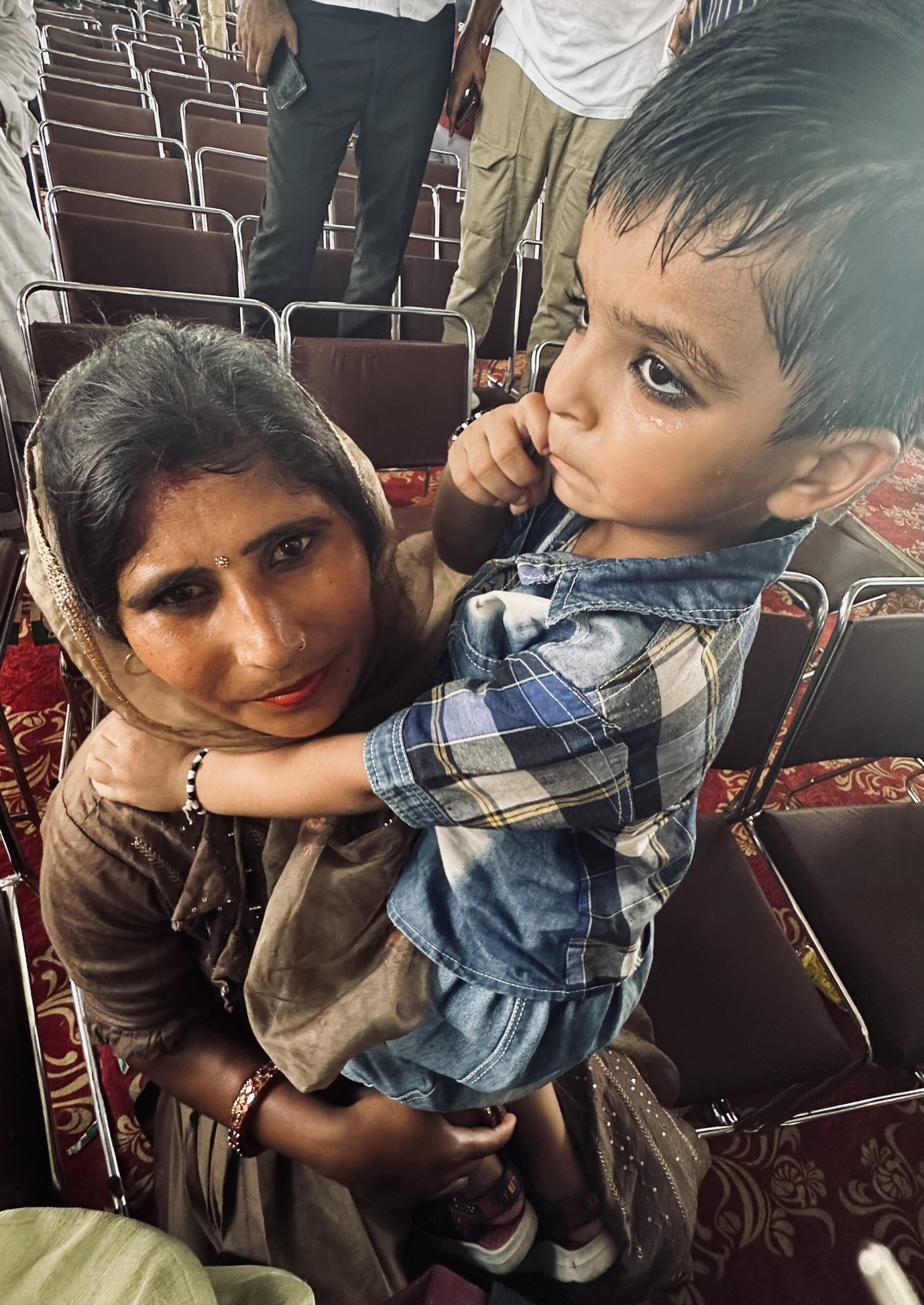 Rajvati carries her 2-year-old son through the crowd at Rahul Gandhi's rally[/caption]