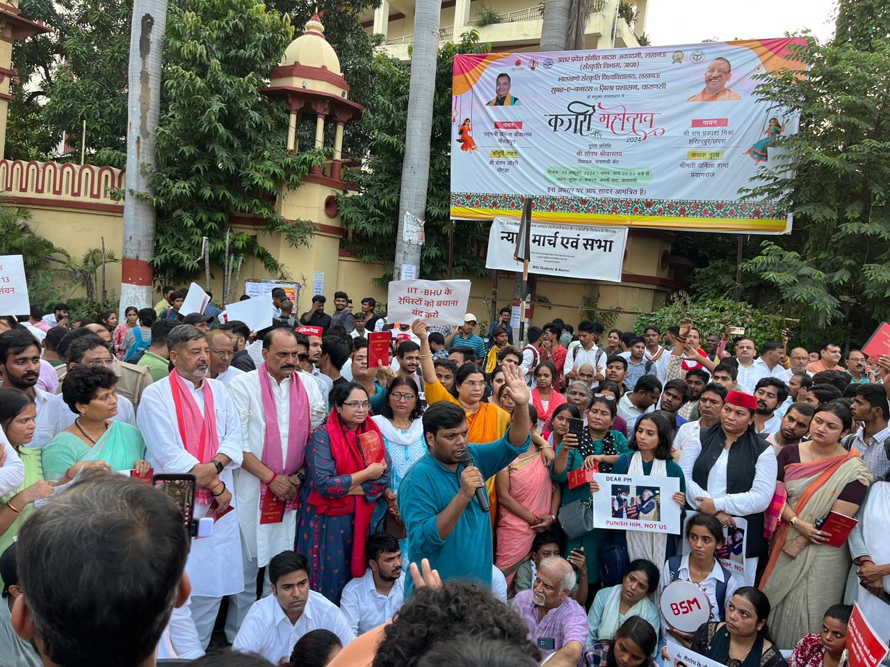 A protest against the suspension of the students was held at the university’s Lanka Gate on Monday, attended by various political figures, including Samajwadi Mahila Sabha National President Juhi Singh, Chandauli MP Virendra Singh, NSUI National President Varun Chaudhary, MLA Prabhunarayan Yadav and others.