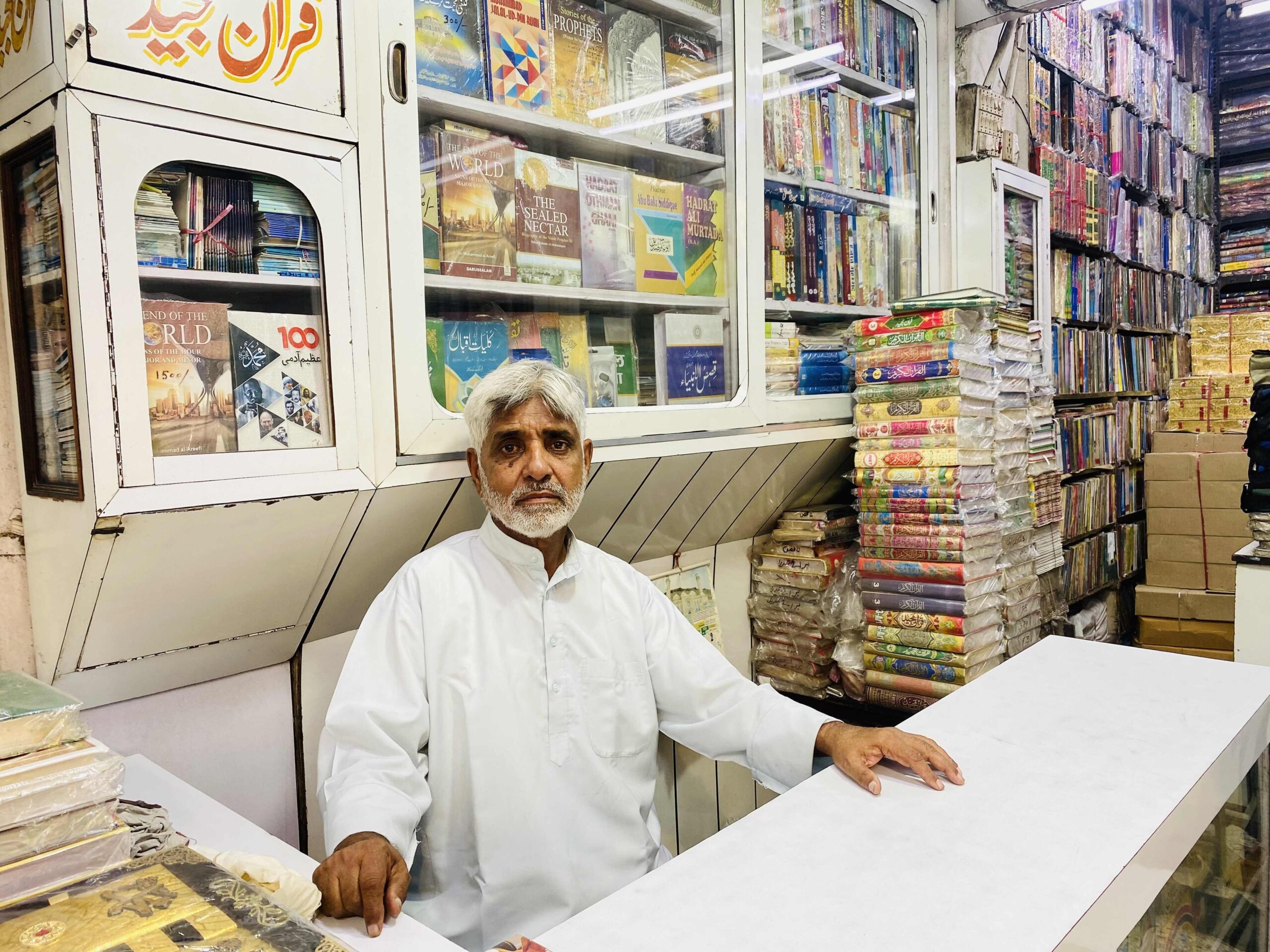 Shahid Ur Rehman, 70, sitting inside his bookshop[/caption]