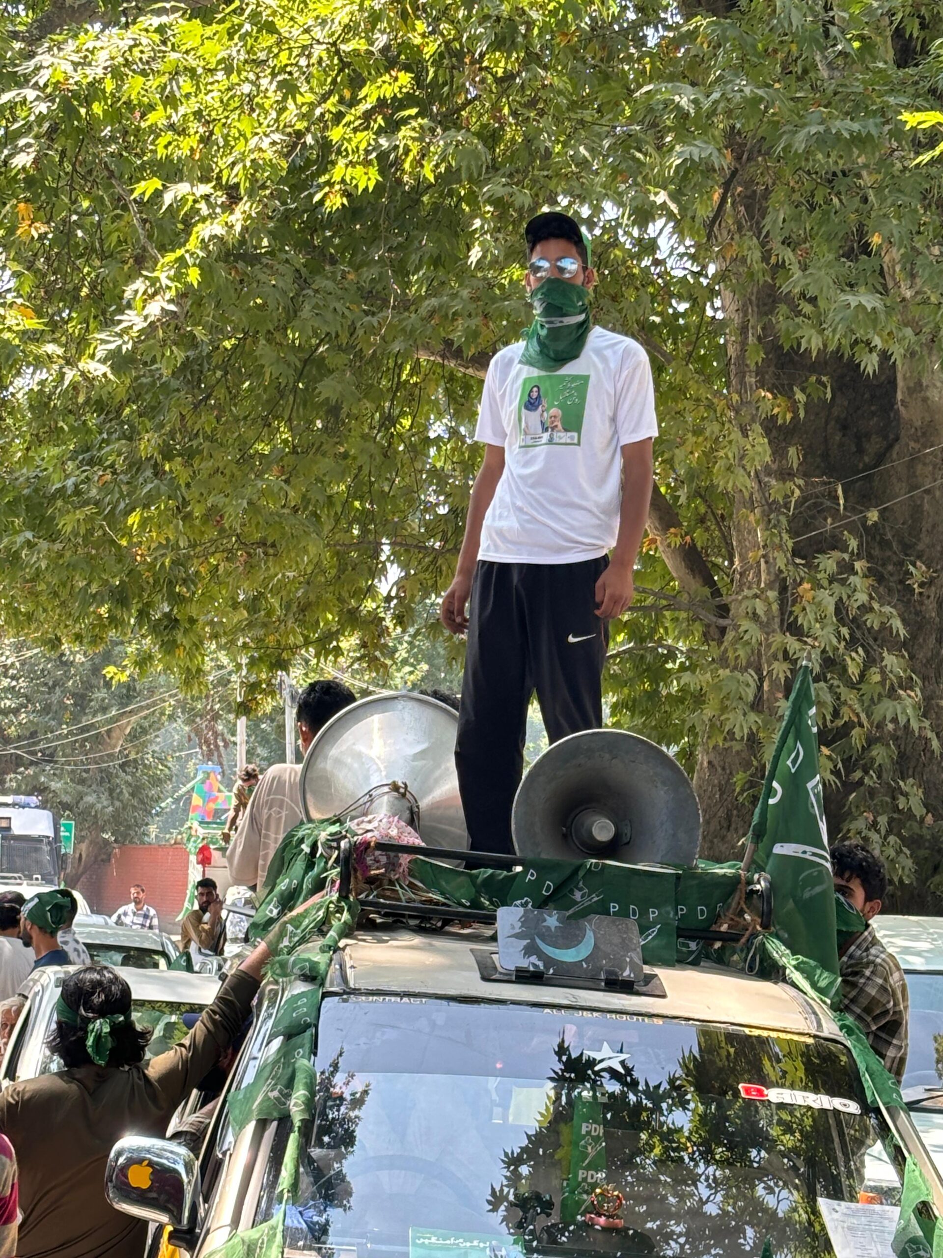 A young PDP supporter stands atop a car during Iltija Mufti’s roadshow in Bijbehara. Photo:Aatif Ammad[/caption]