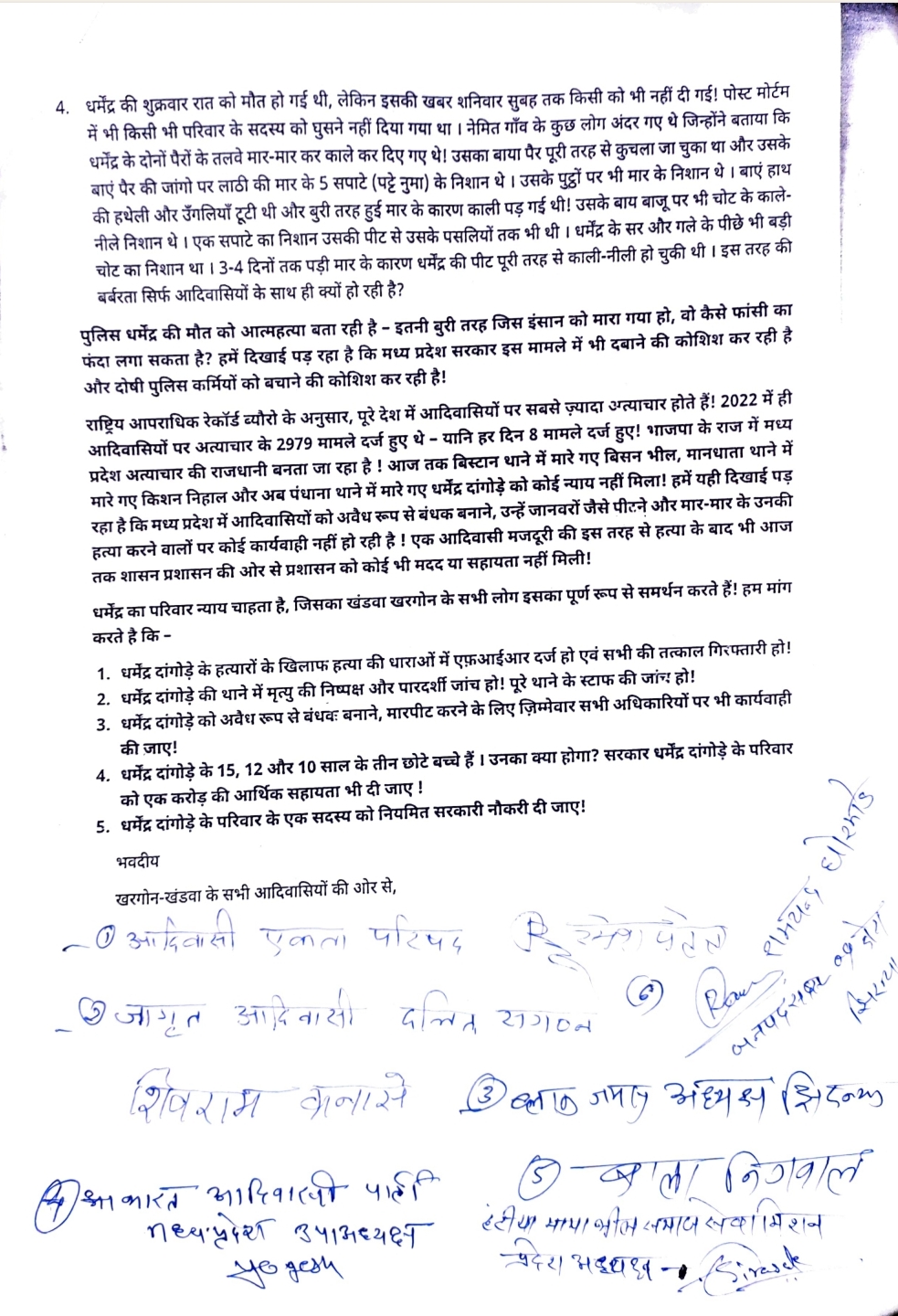 आदिवासी हैं। हाल ही में पंधाना थाने में बर्बर मारपीट और पुलिस प्रताड़ना के कारण हमारे भाई धर्मेंद्र दांगोड़े
