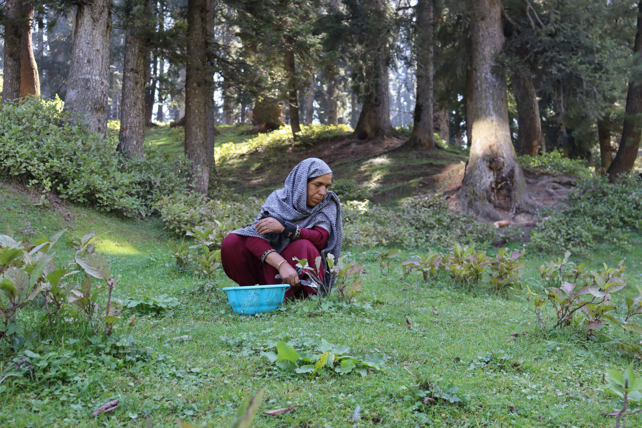In the serene meadows of Yousmarg, kashmir, Rasheeda gathers wild dandelion greens, locally known as "hand" preparing to cook an authentic kashmiri dinner. Photo by Safoora Hilal[/caption]