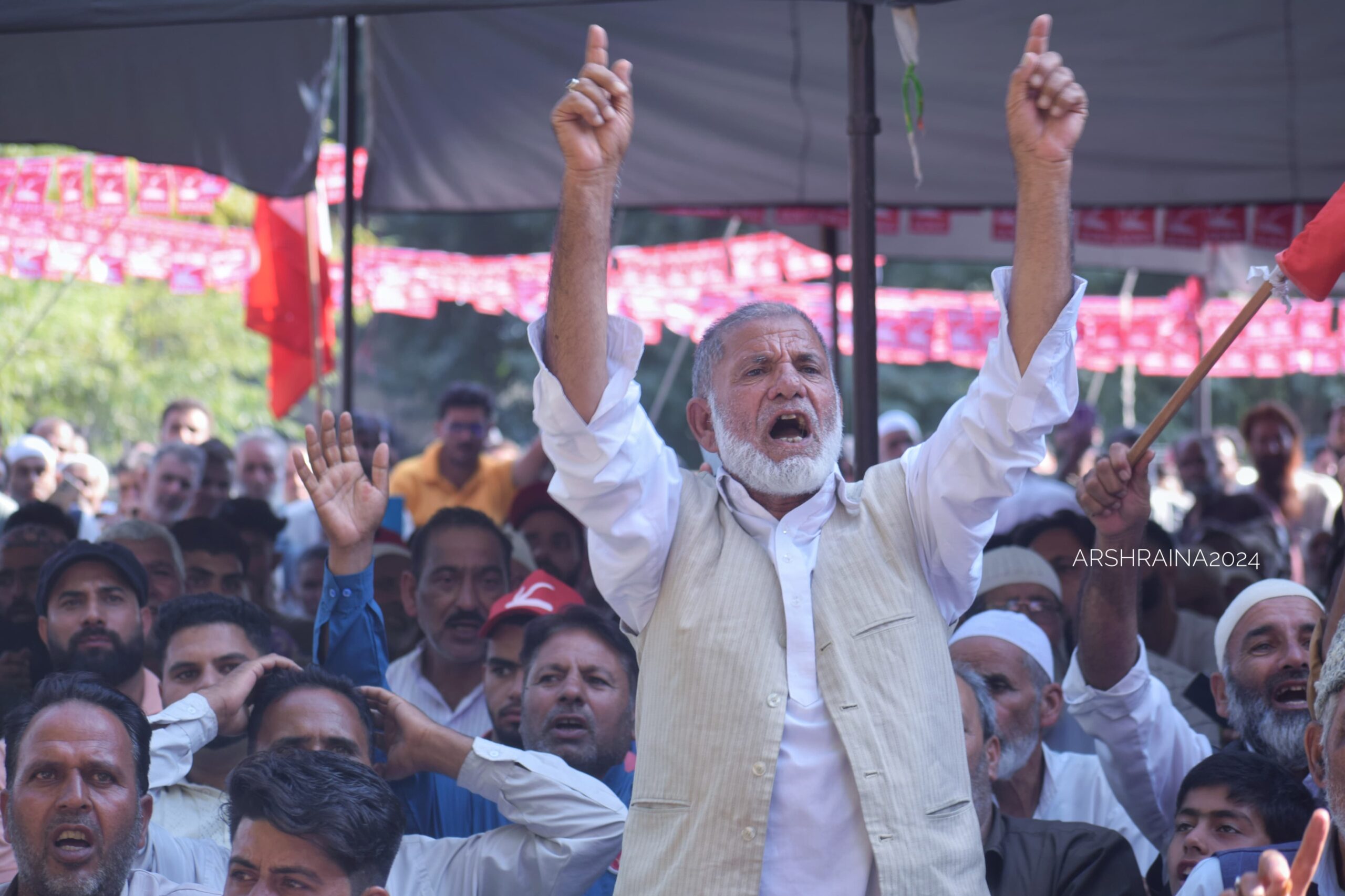 An elderly supporter of the National Conference chants slogans in favor of Omar Abdullah as he delivers a speech during an election campaign in Baramulla. Photo: Arsh Raina[/caption]