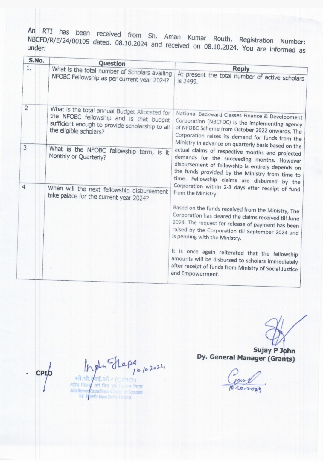 In response to inquiries in Parliament by Kozhikode MP M.K. Raghavan, Social Justice Minister Virendra Kumar stated that the delay in fellowship disbursement was due to the University Grants Commission's (UGC) decision in October 2023 to increase fellowship amounts for Junior and Senior Research Fellows under the scheme. He clarified that the ministry did not have the budget to accommodate the increased fellowship amounts.