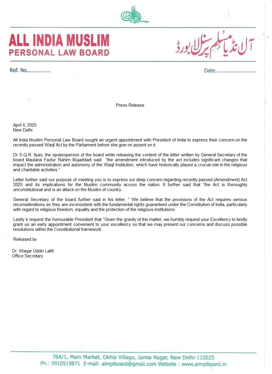 New Delhi: The All India Muslim Personal Law Board (AIMPLB) has sought an urgent appointment with President Droupadi Murmu to voice concerns over the recently passed Waqf (Amendment) Bill, 2025. The board hopes to discuss the bill’s potential ramifications before it receives presidential assent.