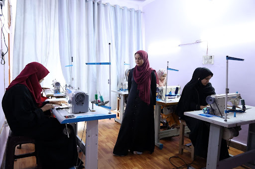 Women work at sewing machines in the Sabaat Center, crafting outfits and other merchandise[/caption]