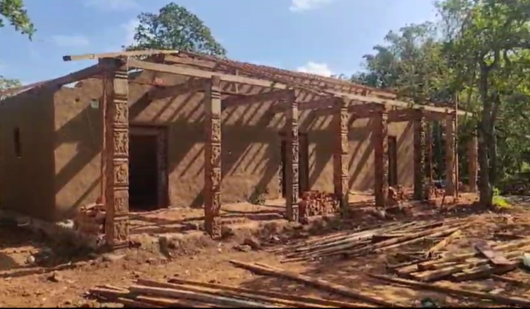 Traditionally made with mud or wooden walls, the Ghotul is being reconstructed with Pandi’s distinctive woodcraft - using four central pillars as its foundation.