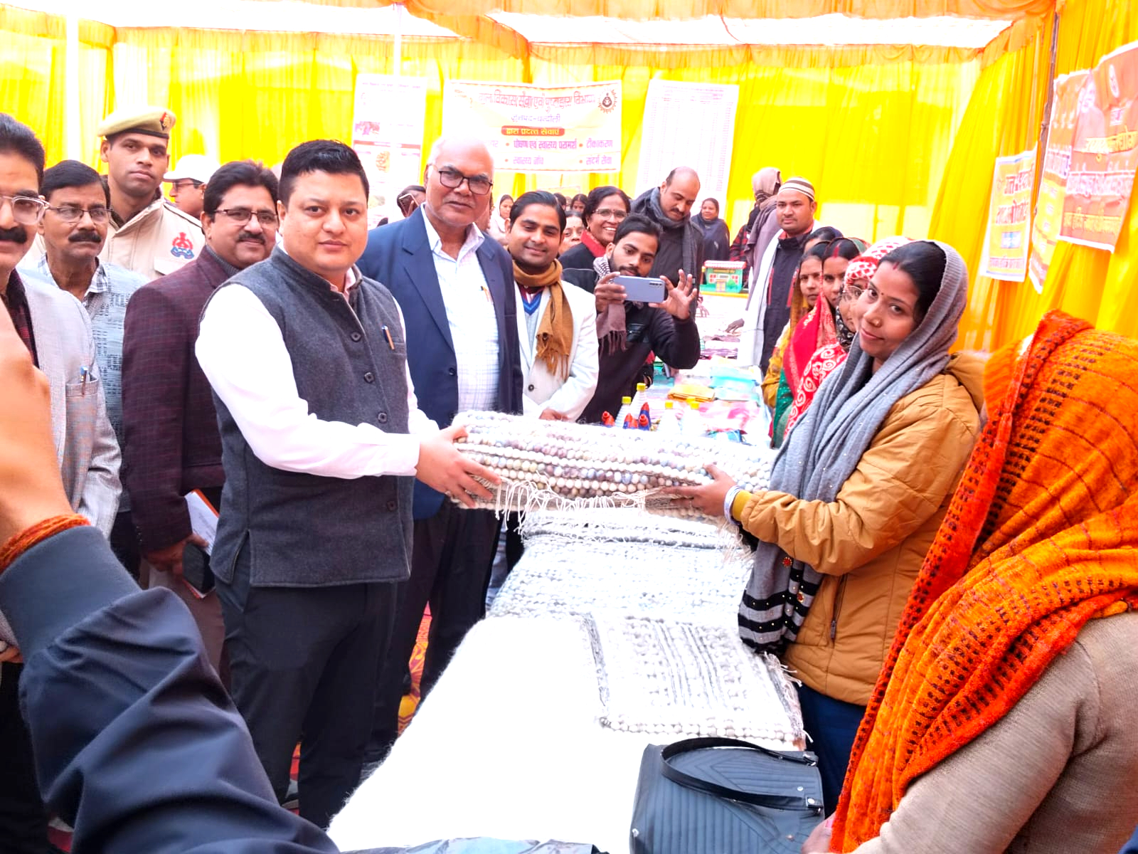 Chandauli District Magistrate Nikhil T Funde buying doormat from Shakeela Bano's stall in the exhibition[/caption]