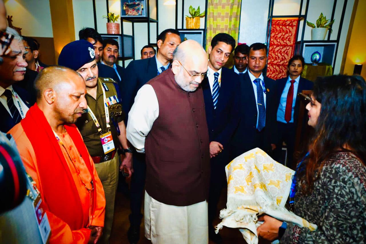 Dr. Angika shows the saree made of threads made from pine apple to Home Minister Amit Shah[/caption]