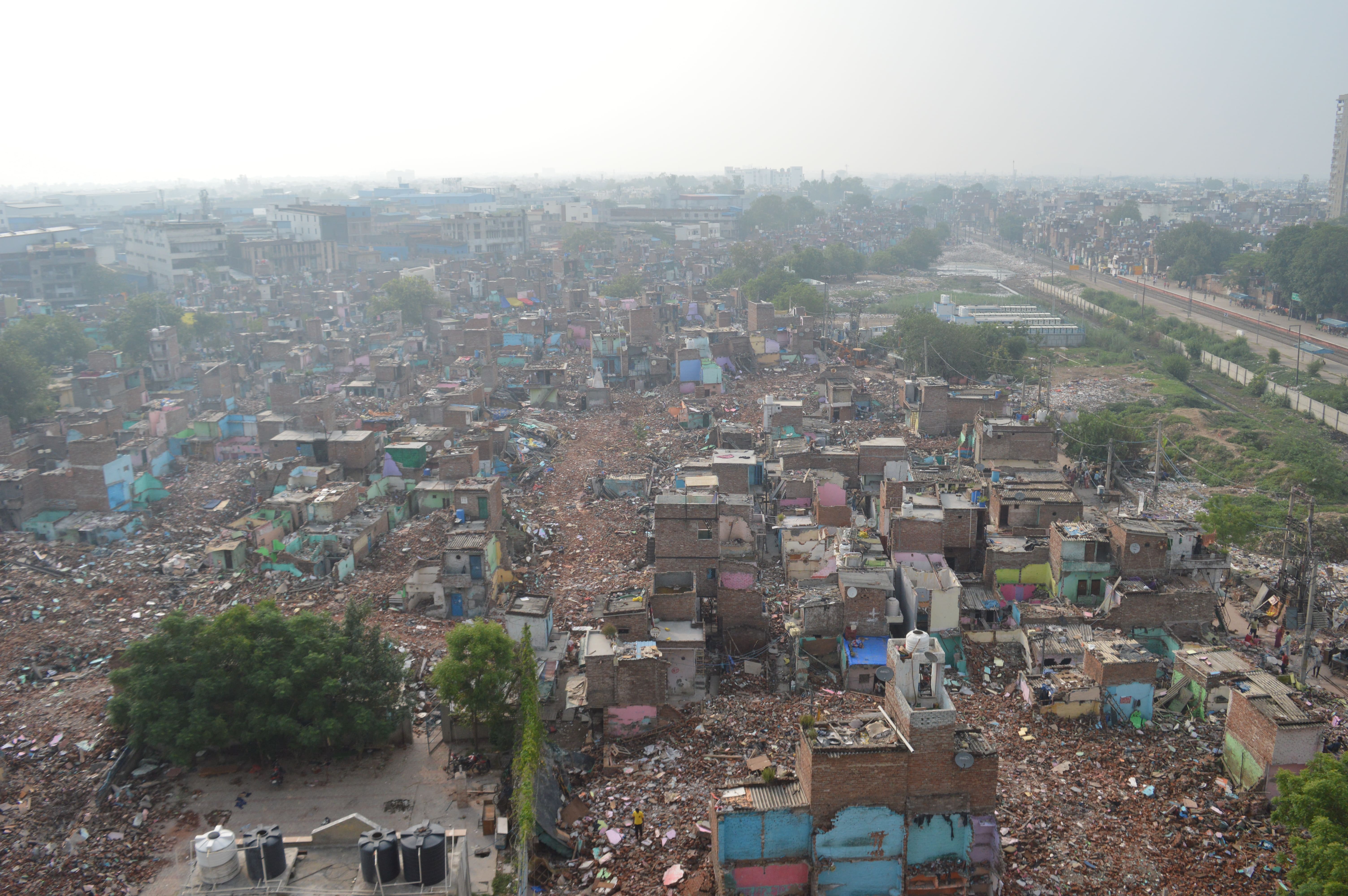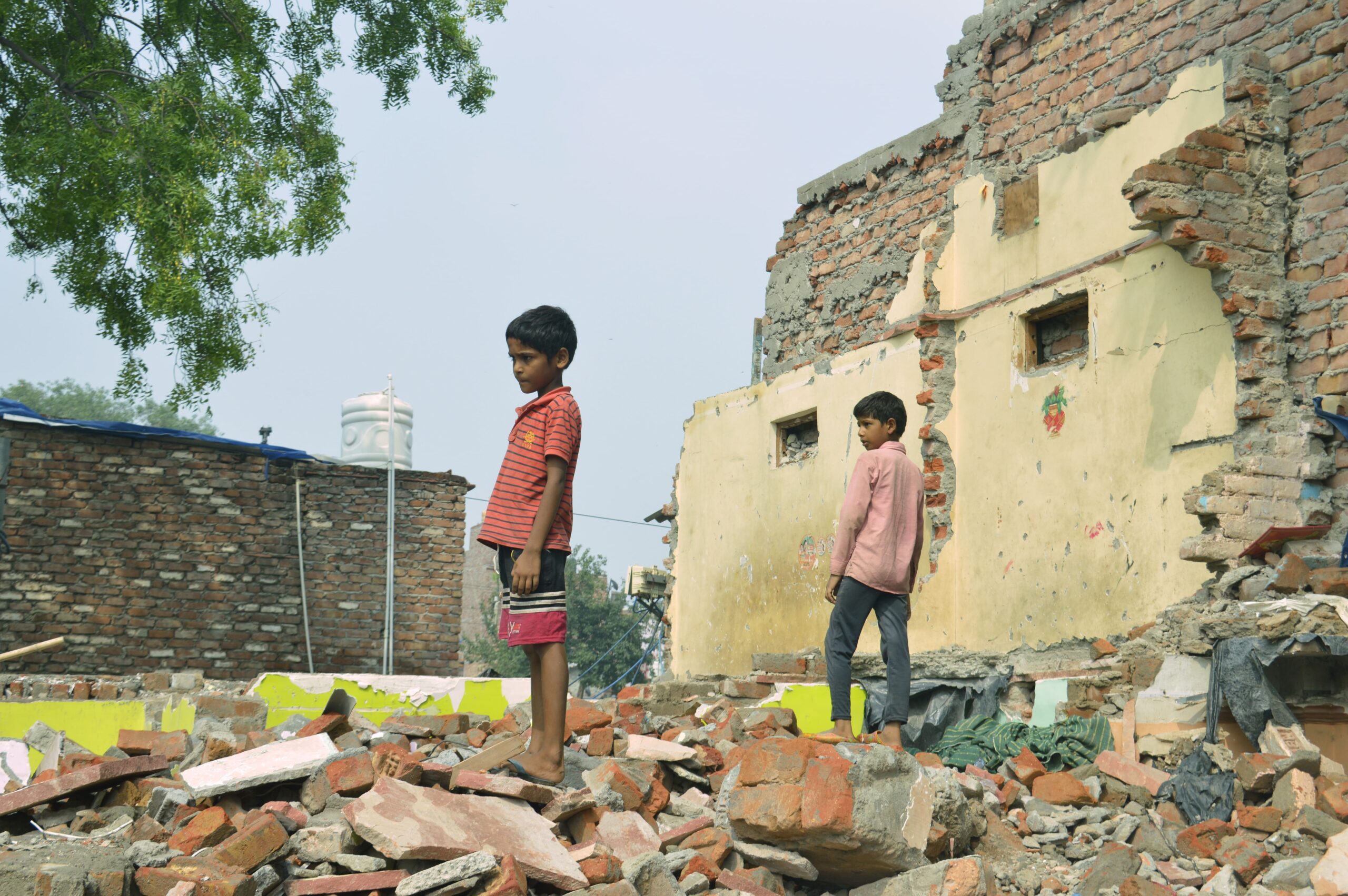 Children stand atop rubble in Jailerwala Bagh, their homes reduced to dust just days before the monsoon rains arrived. Credit: Photo by Aditya Sharma.[/caption]