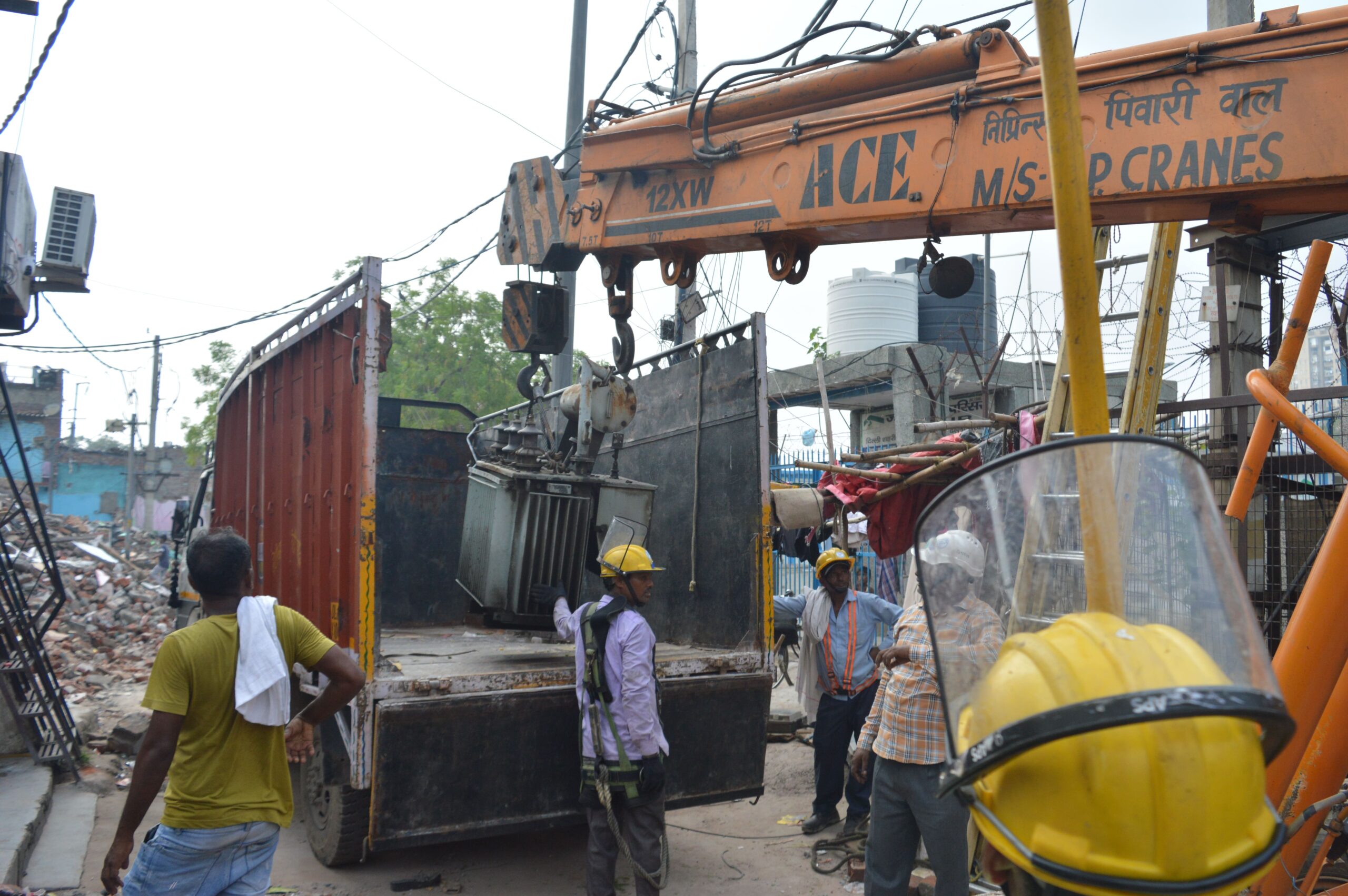 Workers use a crane to remove electrical infrastructure after the eviction drive. Credit: Photo by Aditya Sharma.[/caption]