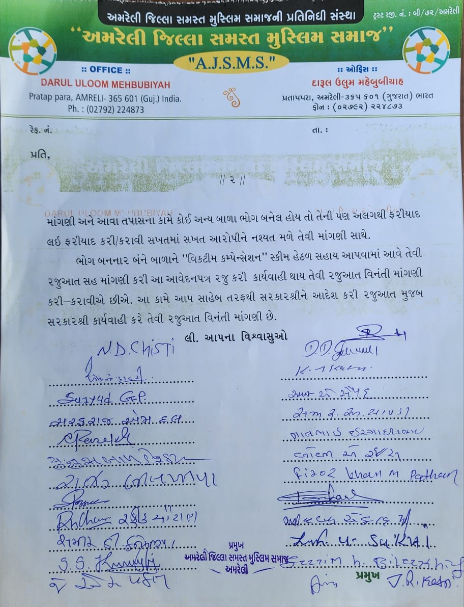 In between the chain of shocking socio-political responses, the Patel community came to support the accused, and the Hindutva organisations allegedly reached the police station to defend him. Local Muslims, on the other hand, held a demonstration in solidarity with the survivors. Influential Muslims of Amreli wrote a letter under the banner of Darul Uloom Mehbubiyah to demand justice and strict punishment for the culprit. The second teacher of the municipal school also joined the protestors. People drew attention to the fact that the alleged incident was probably the second such case in his "criminal records".