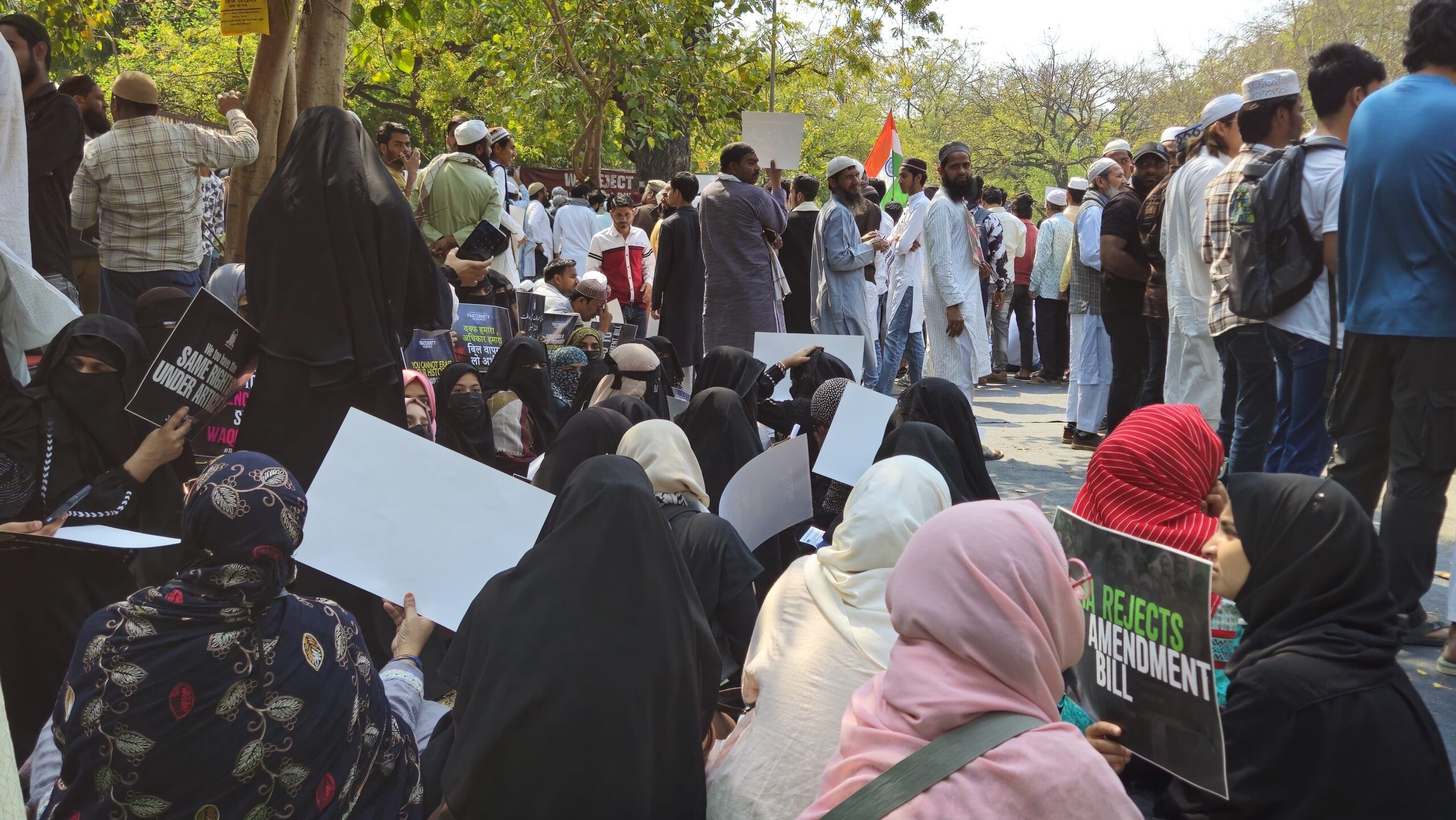 Protesters hold placards and the Tricolour as they demonstrate against the Centre’s Waqf (Amendment) Bill, 2024 (Courtesy: Syed Abubakr & Sumit Singh)[/caption]