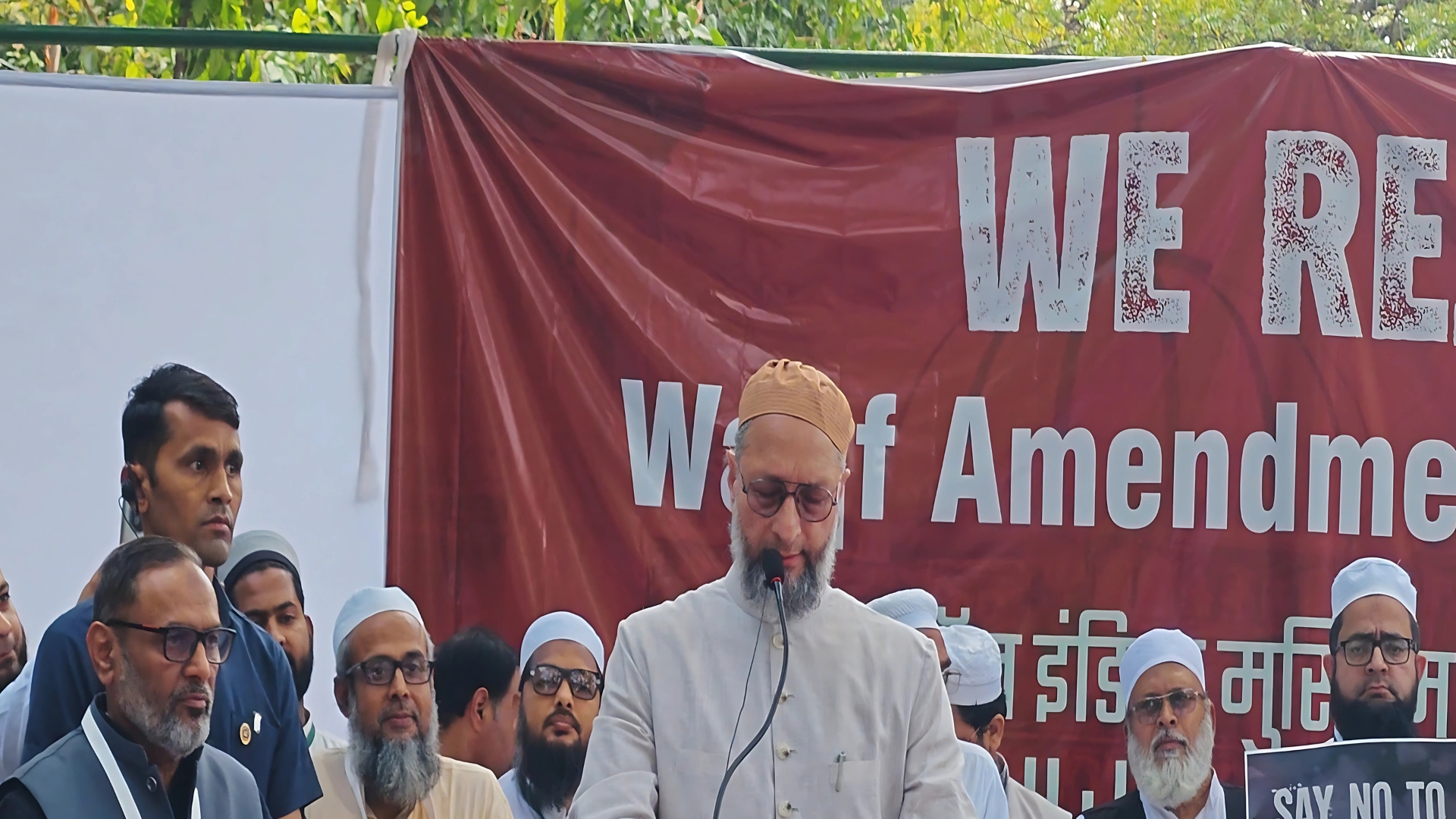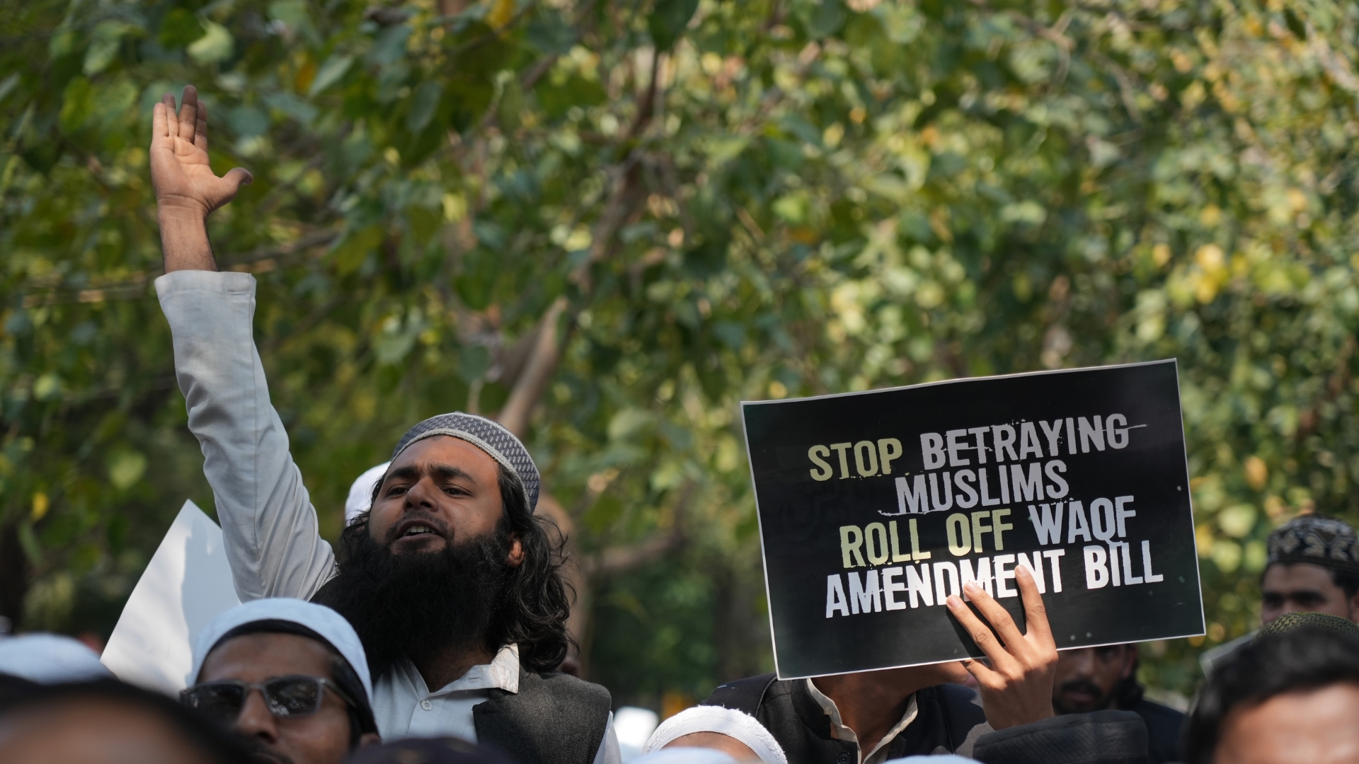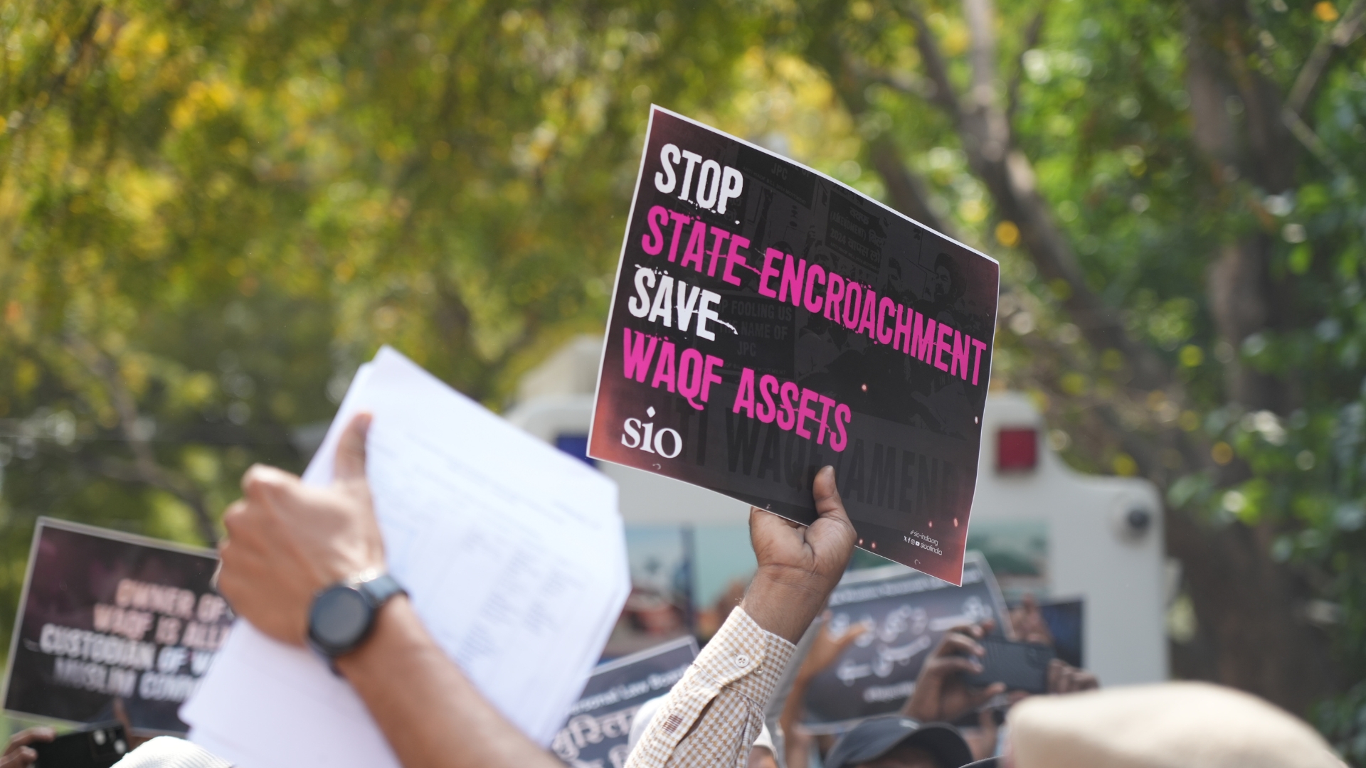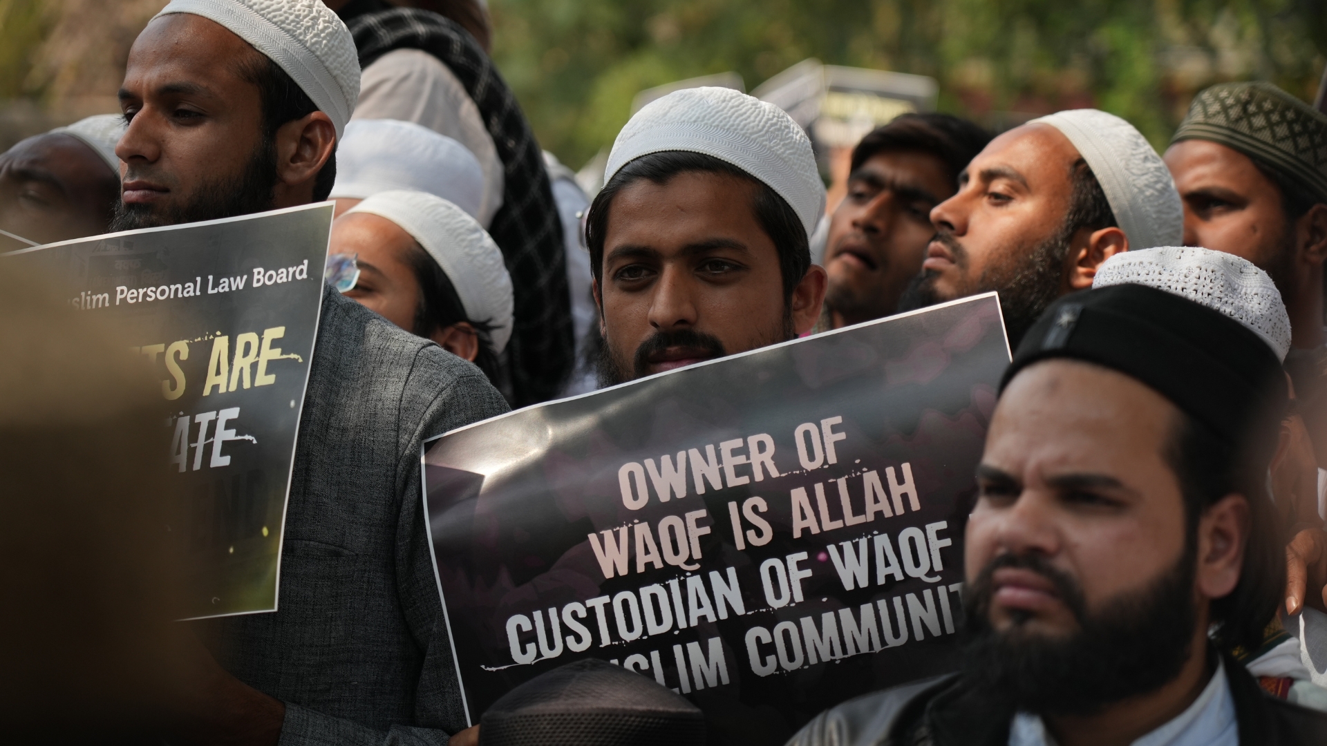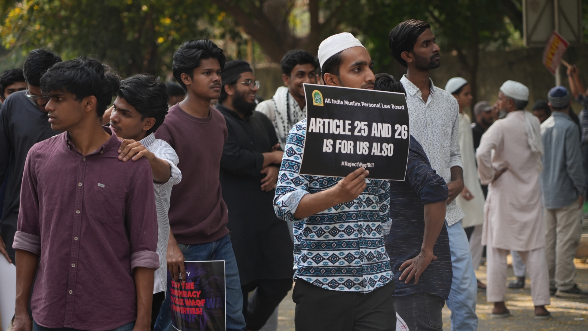 Men holding a placard that read, “Owner of Waqf is Allah, Custodian of Waqf is the Muslim Community”, participated in the protest to voice their opposition to the Waqf Amendment Bill.