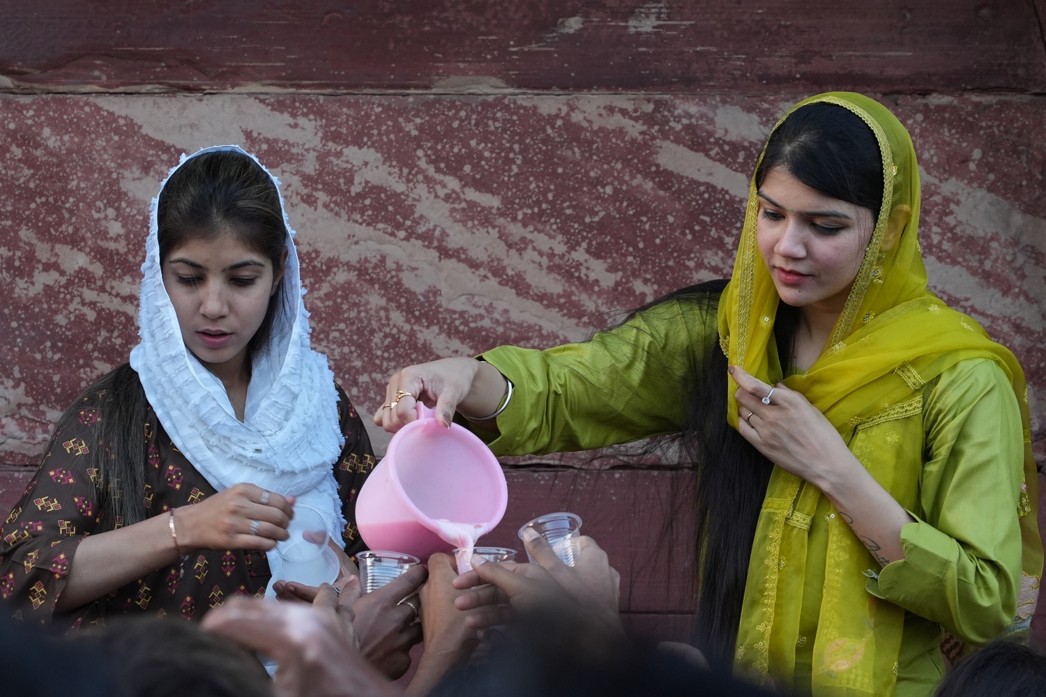 Neha Bharti and her friend distribute sharbat at Jama Masjid, ensuring fasting individuals have a cool drink before iftar.[/caption]