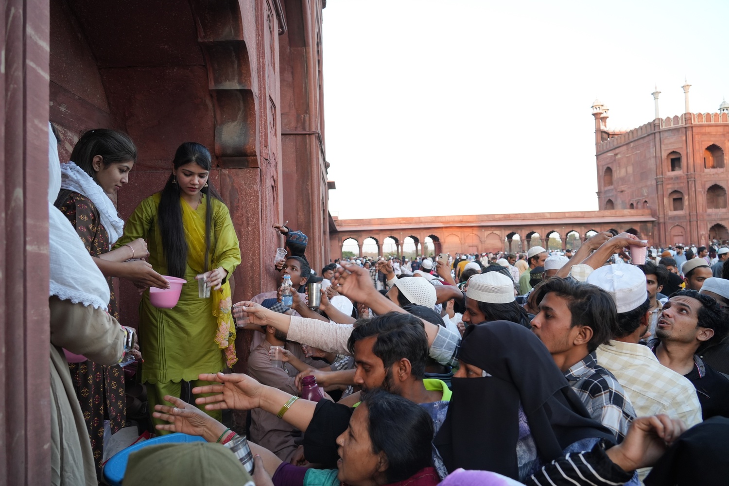 Hundreds eagerly take sharbat just minutes before iftar, as the courtyard of Jama Masjid fills with anticipation[/caption]