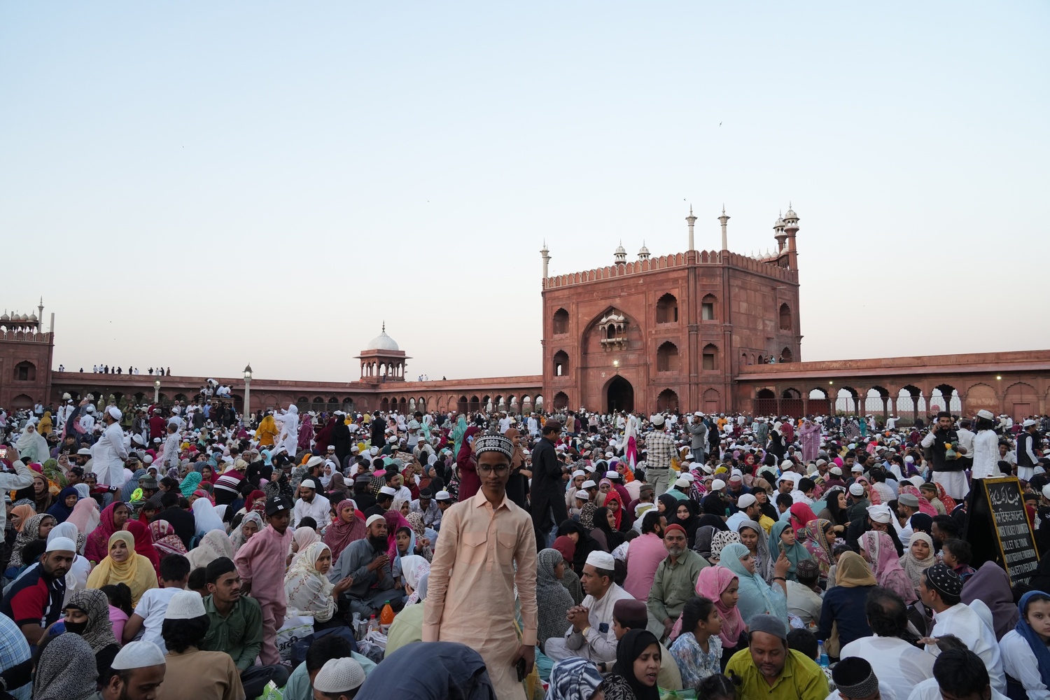 Thousands of Muslims arrive at Jama Masjid, spreading mats and opening food packets to break their fast in a spirit of togetherness.[/caption]